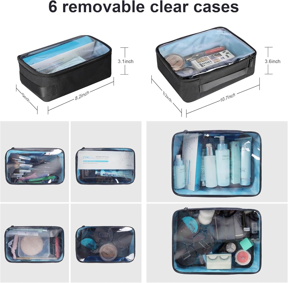 Easy Access to Your Cosmetics - Our travel cosmetic bag has 6 removable cases, you can easily organize your cosmetics, brushes, tools, and accessories for quick and easy access. Each case designed with clear window and carrying handle for easy to classify makeup and pull out.
