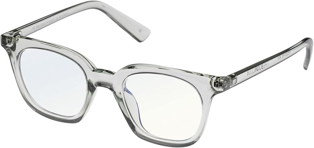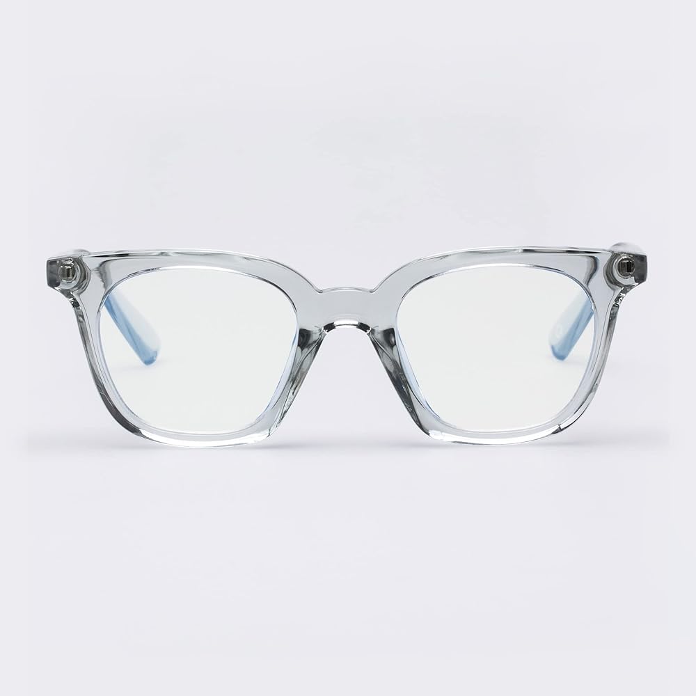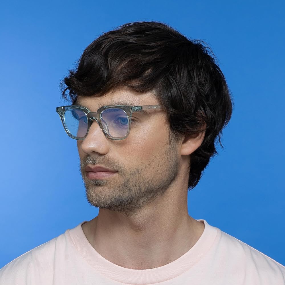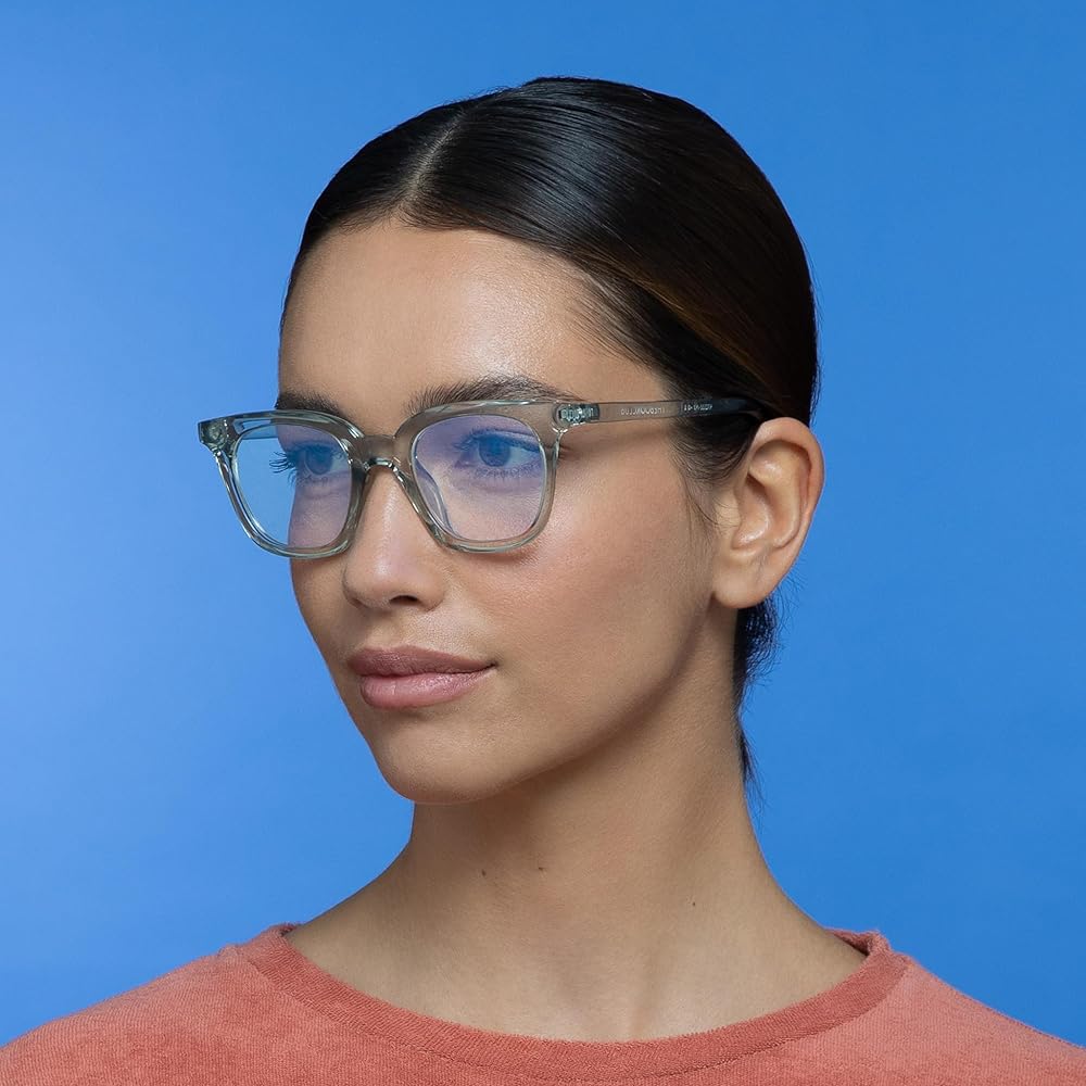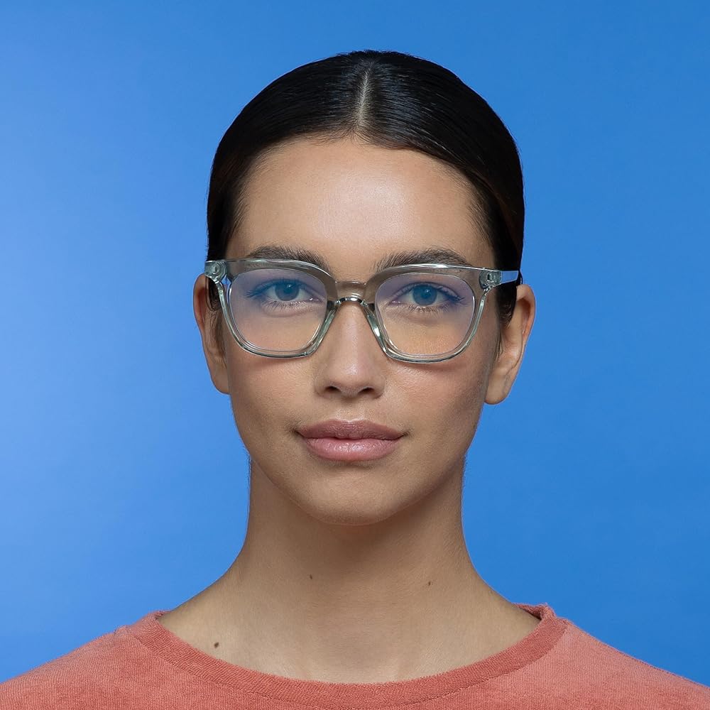 Transparent acetate frames, Anti-glare, blue light filtering lenses and BPA-free frames, May be recycled with household plastics after removing lenses and hinge pins