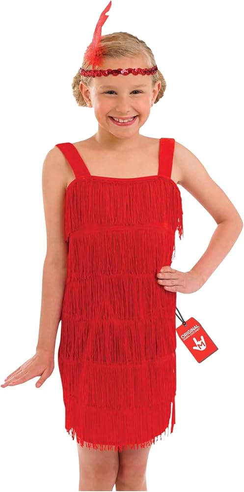 includes red fringed flapper dress, matching red sequined headband with feather.