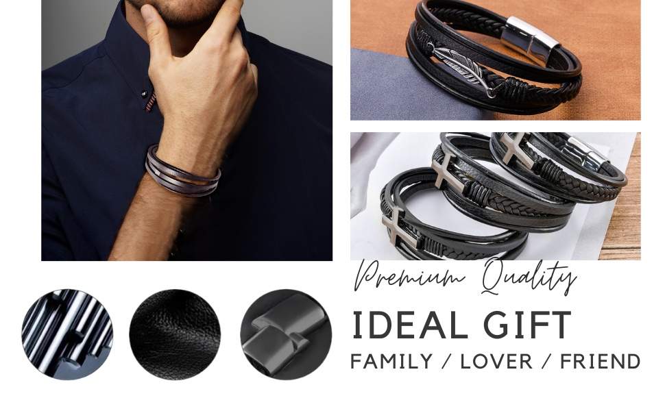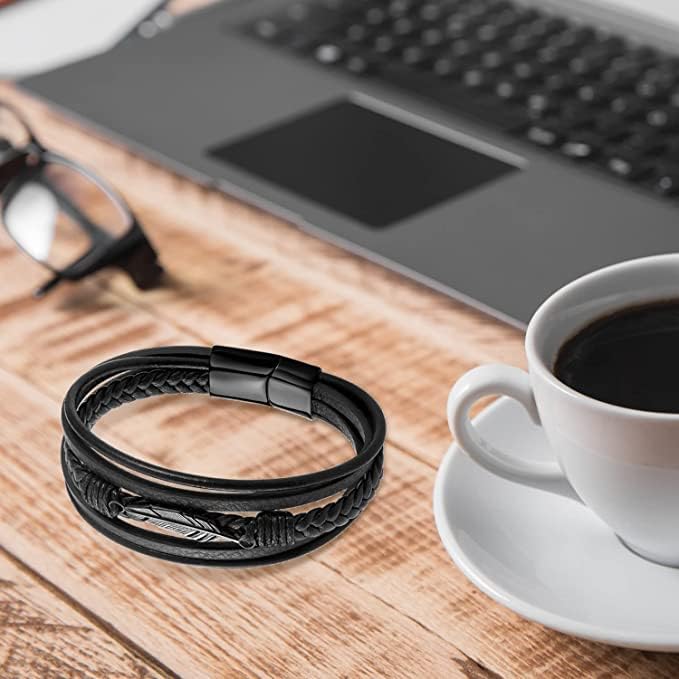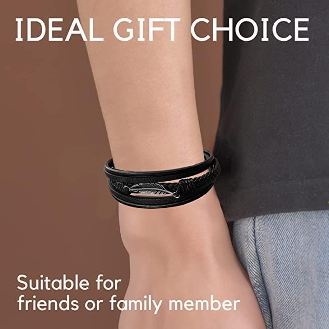 Braided Leather Bracelet for Men - Multi-Layer black leather bracelet with magnetic clasp stainless steel leaf pattern Specification Size: 8.5 inches Color: Black Material: Leather & Stainless Steel Pattern: Leaf Unique Design Our mens bracelet is multi-layer braided with a black horizontal metal on it. Black leather bracelets are classic for both men and women. The stainless steel wristband is a unisex decor with unique design that suits your daily outfits. Moreover, the leaf pattern is not only time-honored but also classic. It adds a sense of charm and cool to the bracelets for men and women. Premium Quality Our mens bracelets are made of premium quality leather and stainless steel that make them rust-proof, nickel-free and do not smell weird. The men bracelets are fine handcraft, made of soft braided leather material. Our high quality bracelets for men are never out of style, so you can show your unique taste of fashion. Strong Magnetic Clasp Our mens bracelet is made of leather with a strong magnetic clasp. It is easy to put on without falling off. Besides, our magnetic clasp is made of stainless steel with black finish, unlike common bright silver-tone steel color, that also match the design of the whole black men bracelet. Durable & Easy Maintenance Our high-quality leather bracelet is durable to every day wear-and-tear and also hypoallergenic that you can comfortably wear the cool bracelets. Besides, these leather bracelets for men are easy to take care. The mens bracelets will not fade or tarnish, and scratch resistant. You can wear these leather bracelets during sports, physical activities or parties. Ideal Gift Choice Our black braided leather bracelet is your perfect gift choice for men, women, teen, or boys, who like punk and vintage appearance. The leather wristband for men are suitable for friends or family member as a cool bracelet, grandson bracelet, or a graduation gift.