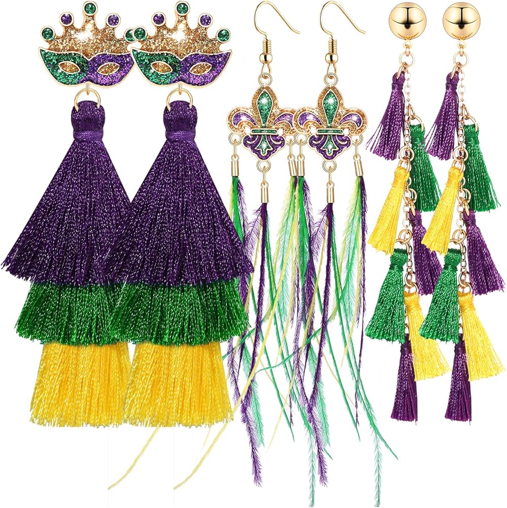 أقراط مميزة مصنوعة يدويًا - أضف المرح والتألق إلى ملابسك في يوم الثلاثاء السمين مع أقراط ماردي جراس المتدلية للنساء! تحتوي الأقراط على شرابات وريش أخضر وذهبي وأرجواني معلق على أقراط ساحرة من قناع التاج فلور دي ليز. كل لون له معناه الخاص: اللون الأرجواني للعدالة، والأخضر يعني الإيمان، والذهب يمثل القوة. يمكنك إعادة ارتداء إكسسوارات مجوهرات Mardi Gras الرائعة هذه عامًا بعد عام. أقراط Mardi Gras المصنوعة يدويًا موجودة هنا في الوقت المناسب لـ Fat Tuesday 2023