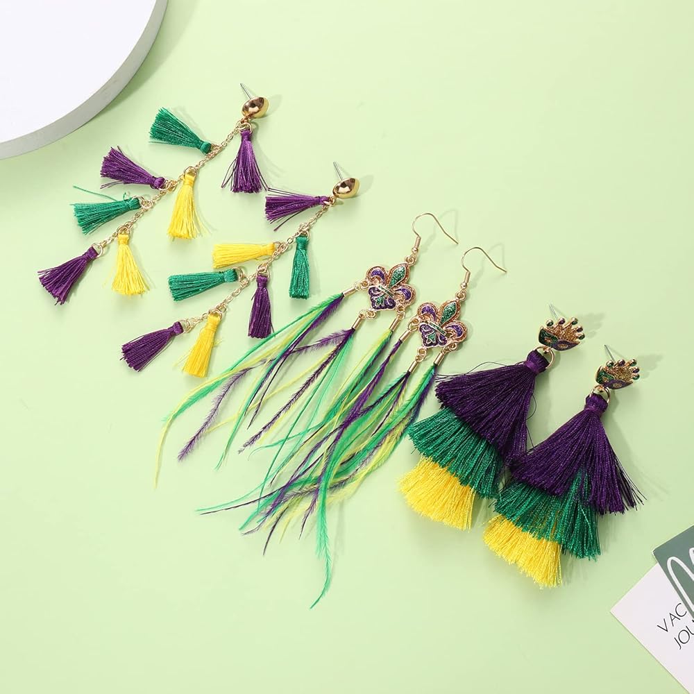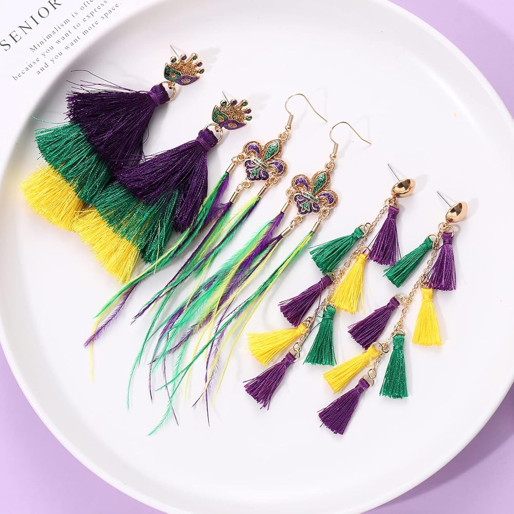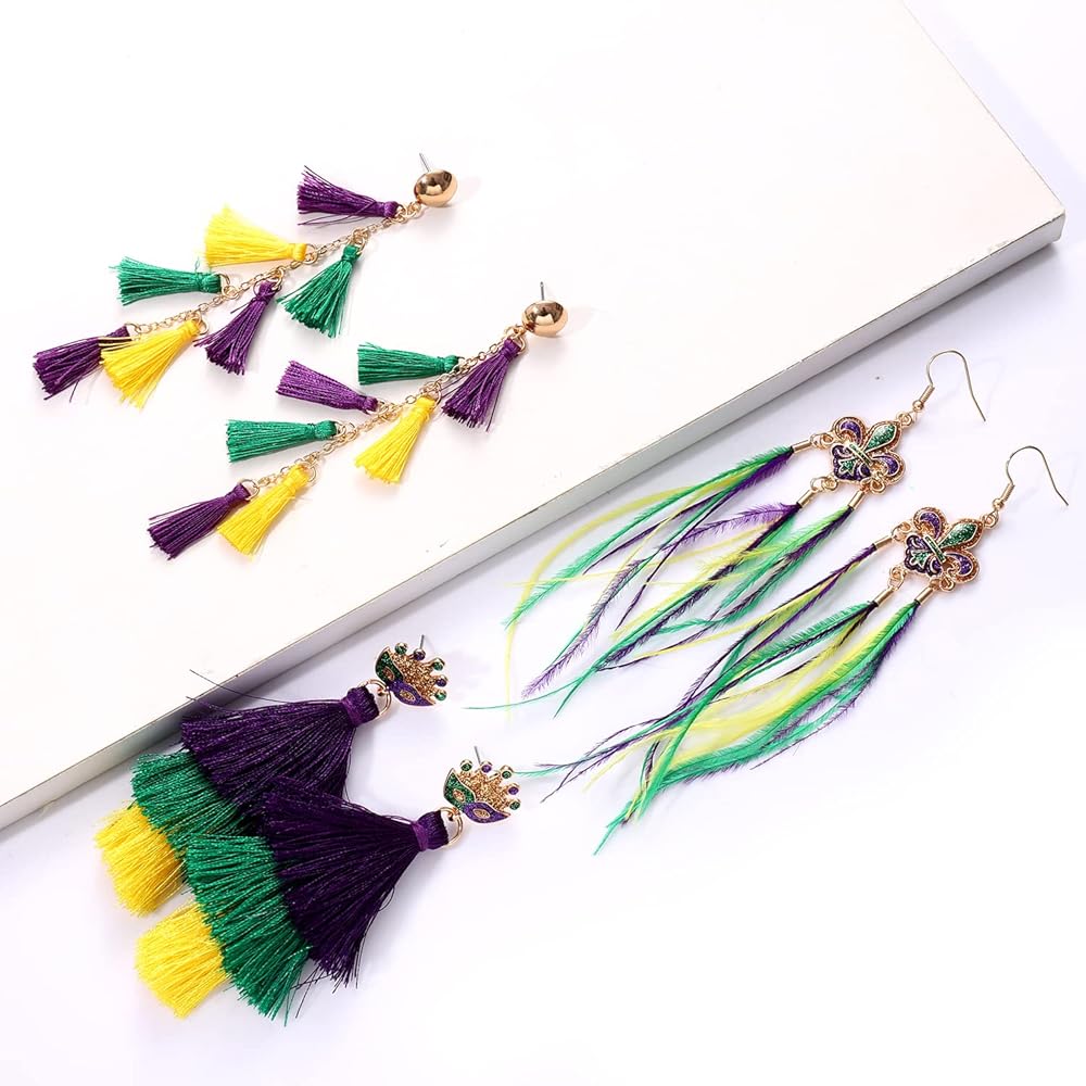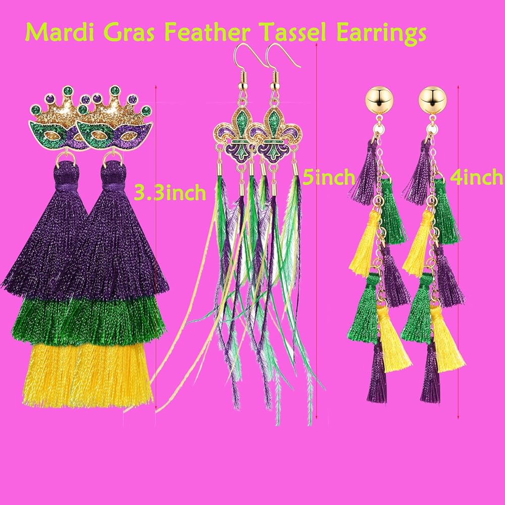 مجموعة أقراط مضادة للحساسية - الكرنفال هو الوقت المناسب في لويزيانا عندما يُسمح لنا بالجنون مع ملابسنا وإكسسواراتنا، هذه الأقراط المتدلية الرائعة تناسبك مثل الأميرة لارتدائها في يوم العرض! مصنوعة من شرابات وريش وسبائك باللون الأرجواني والأخضر والذهبي. لا تسبب الحساسية، وخالية من النيكل والرصاص ومناسبة للآذان الحساسة للفتيات والنساء. هذا الزوج من أقراط ماردي غرا مثالي للارتداء في طريق العرض. فهي لطيفة للغاية وخفيفة الوزن.