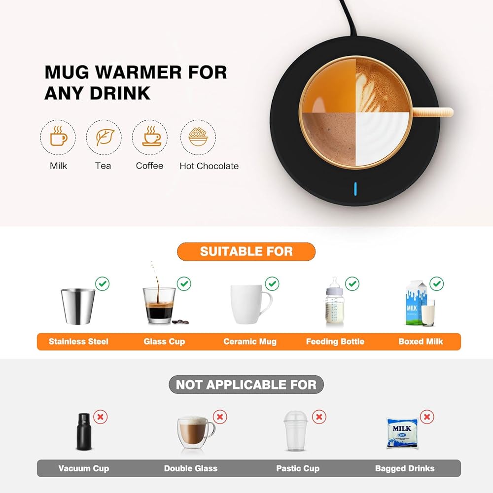 ☕【Coffee Cup Warmer 8h Auto Shut Off】Electric coffee warmer will auto shut-off after working 8 hours. No worry about the potential safety hazards that caused by forgetting to turn off the power.