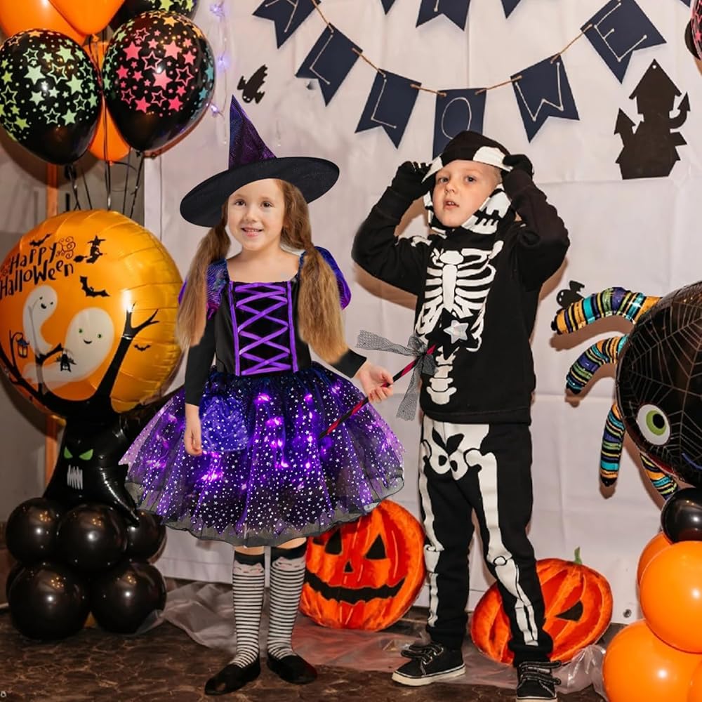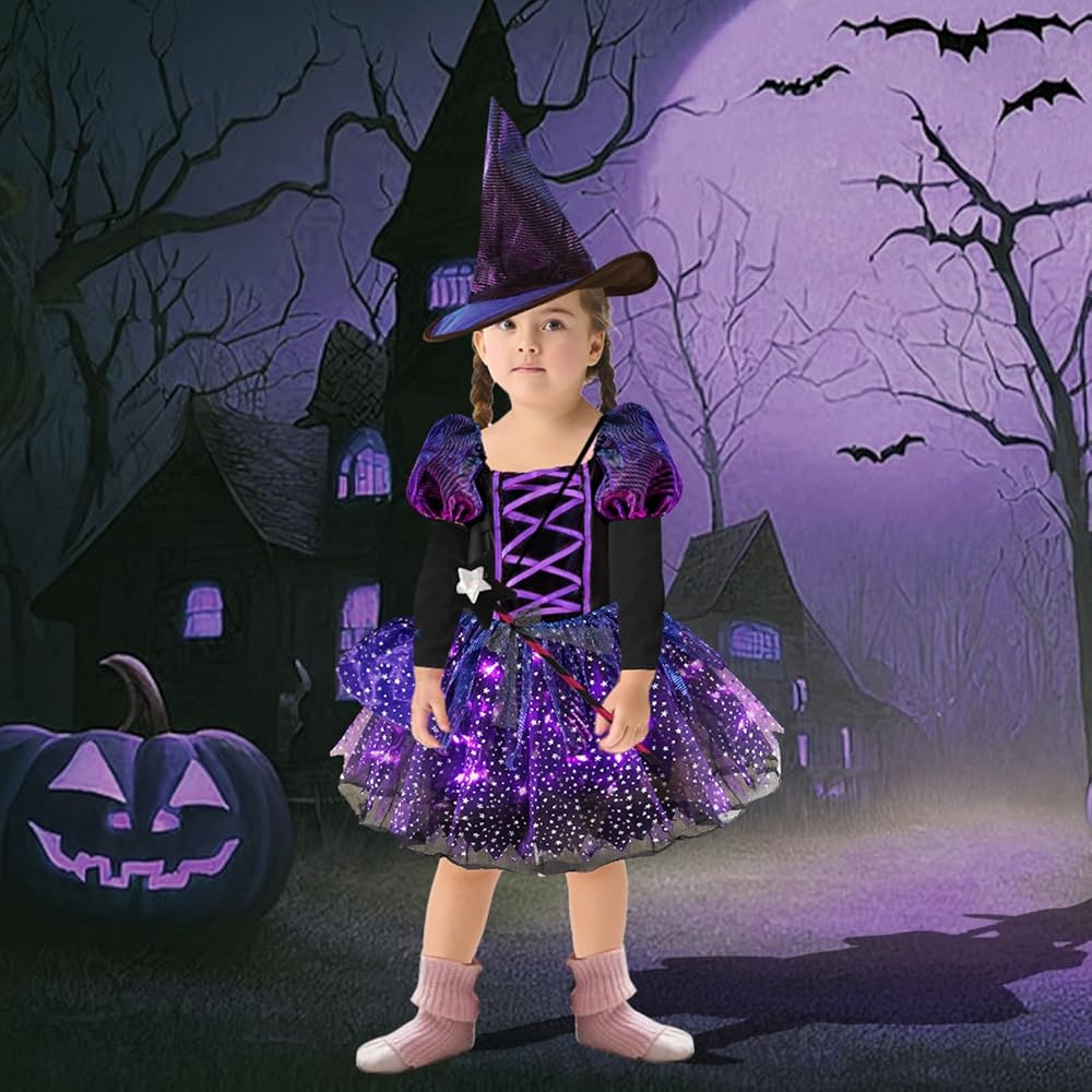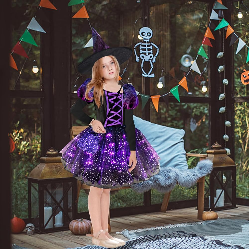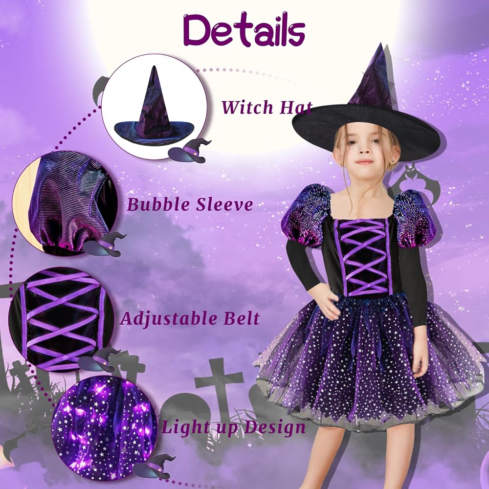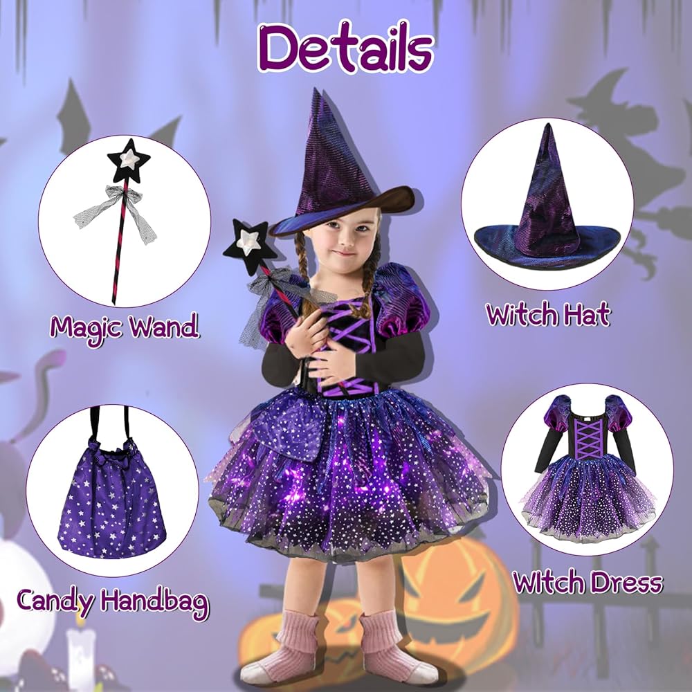 🎇【Magic Light Up Costume】Our halloween light up witch costume for girls includes 1 classic witch hat, 1 magic wand, 1 candy handbag, 1 light up dress with purple tulle layered. The witch costume include a glittery dress and a hat. Nice and elegant for a cute witch during Halloween.