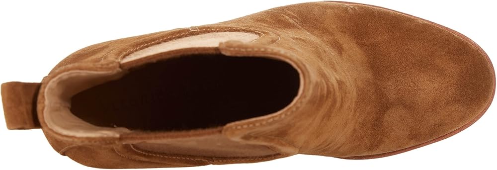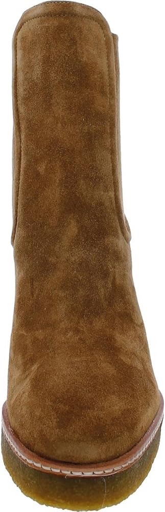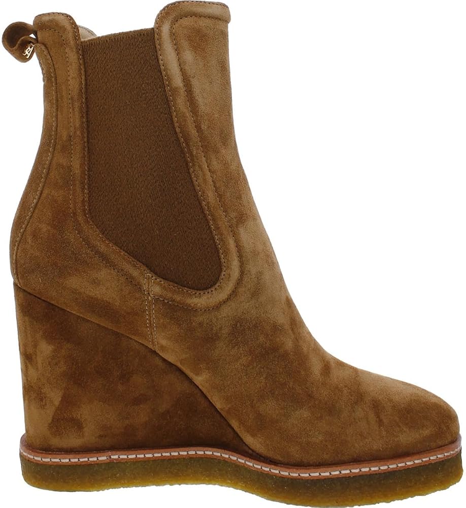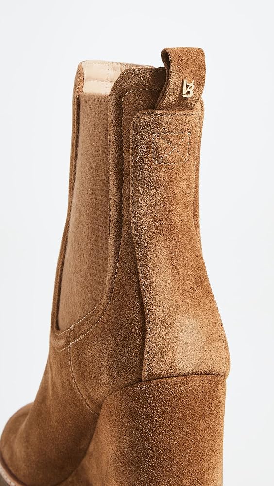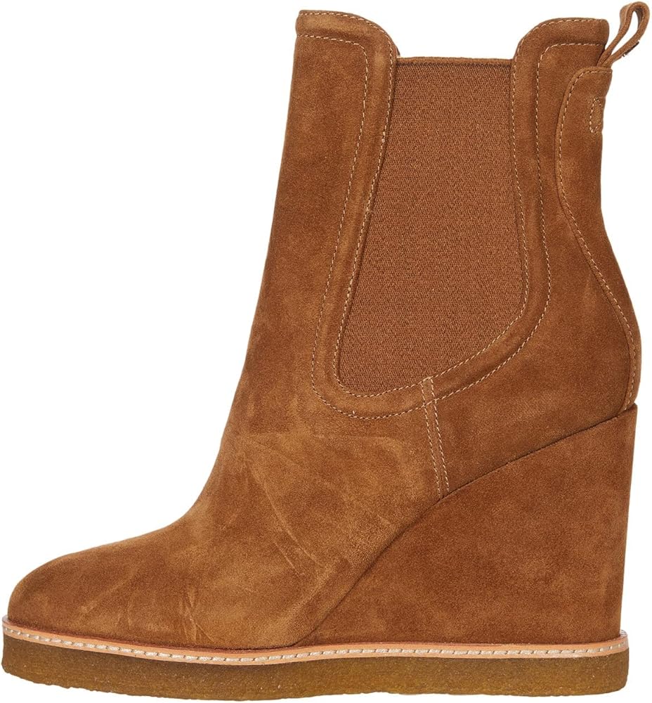 A substantial covered wedge heel provides a significant boost to these Veronica Beard booties, which are crafted from soft brown suede and finished with a classic gum-rubber sole.