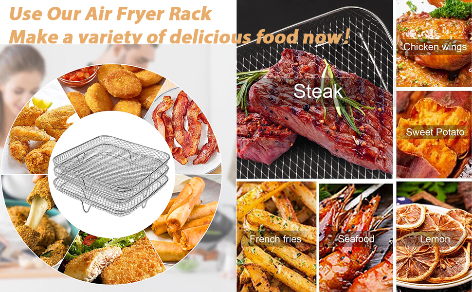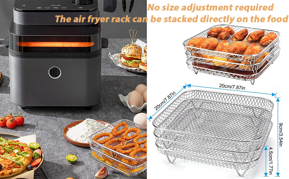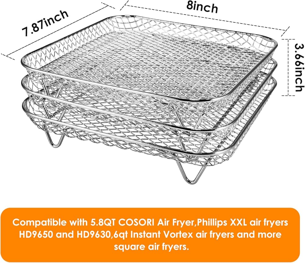 Wide use:The size of square three stackable Layers rack is 8 *7.87 * 3.66 inches.Fit for all standard air fryer 4.2Qt, 5.3Qt, 5.5Qt, 5.8Qt and more XL air fryers, pressure cooker and oven.Compatible with Gowise USA, Philips, Ninjia,Cozyna, etc air fryer brands. Three Stackable Layers Rack no waste of space of your air fryer. Meet the needs of the entire family.
