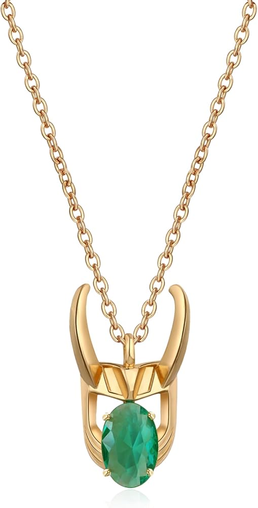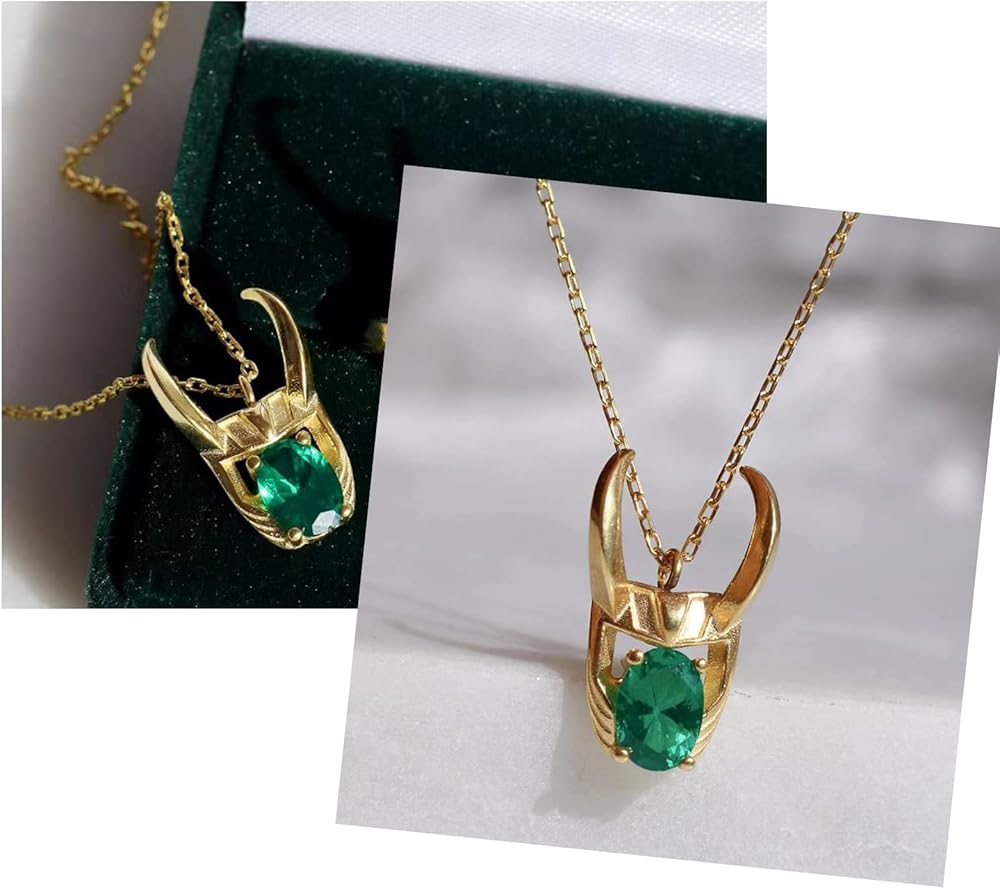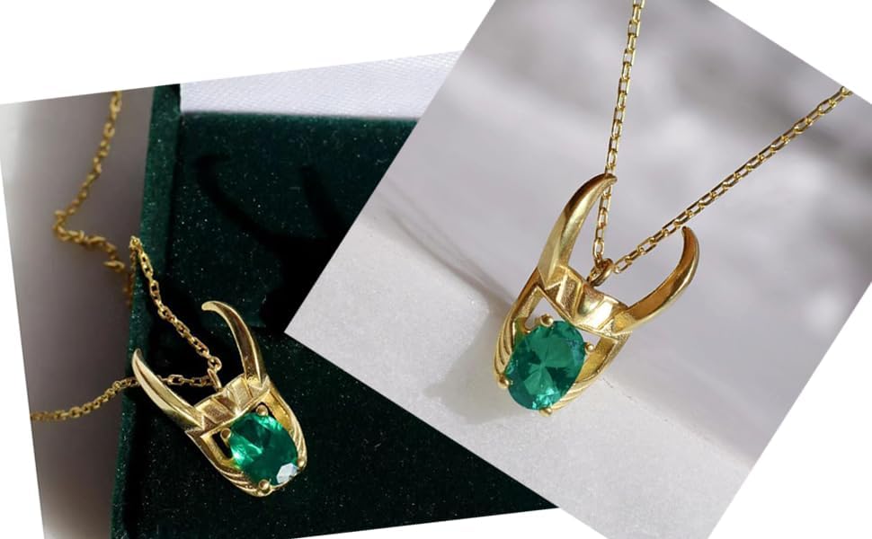Helmet Necklace be inspired by movie. Helmet Necklace made of brass with gold plated,and a green crystal in middle. the chain size 20 inches. Helmet Necklace come in a jewelry box,it is a great gift for fans.