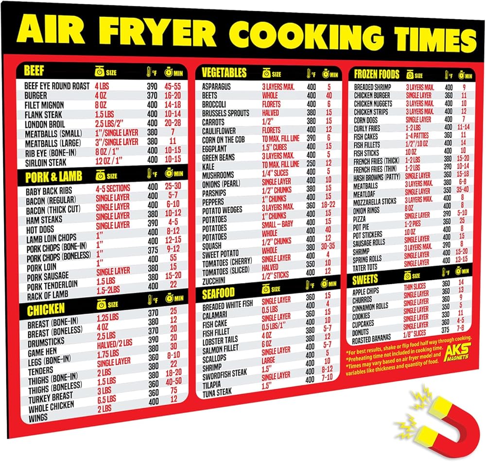 🧲 Comprehensive - Our air fryer chart covers a wide variety of data. Over 90 foods in the categories of Beef, Pork & Lamb, Chicken, Vegetables, Seafood, Frozen Foods and Sweets.