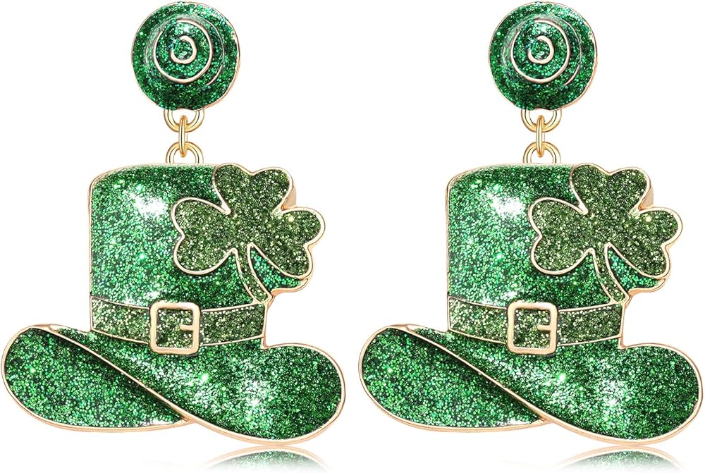 Holiday St Patrick's Day Earrings Dangling Green Shamrock Earrings Festive Clover Luck Hat Leprechaun Funny Irish Drop Dangle Earrings Jewelry Gift for Women