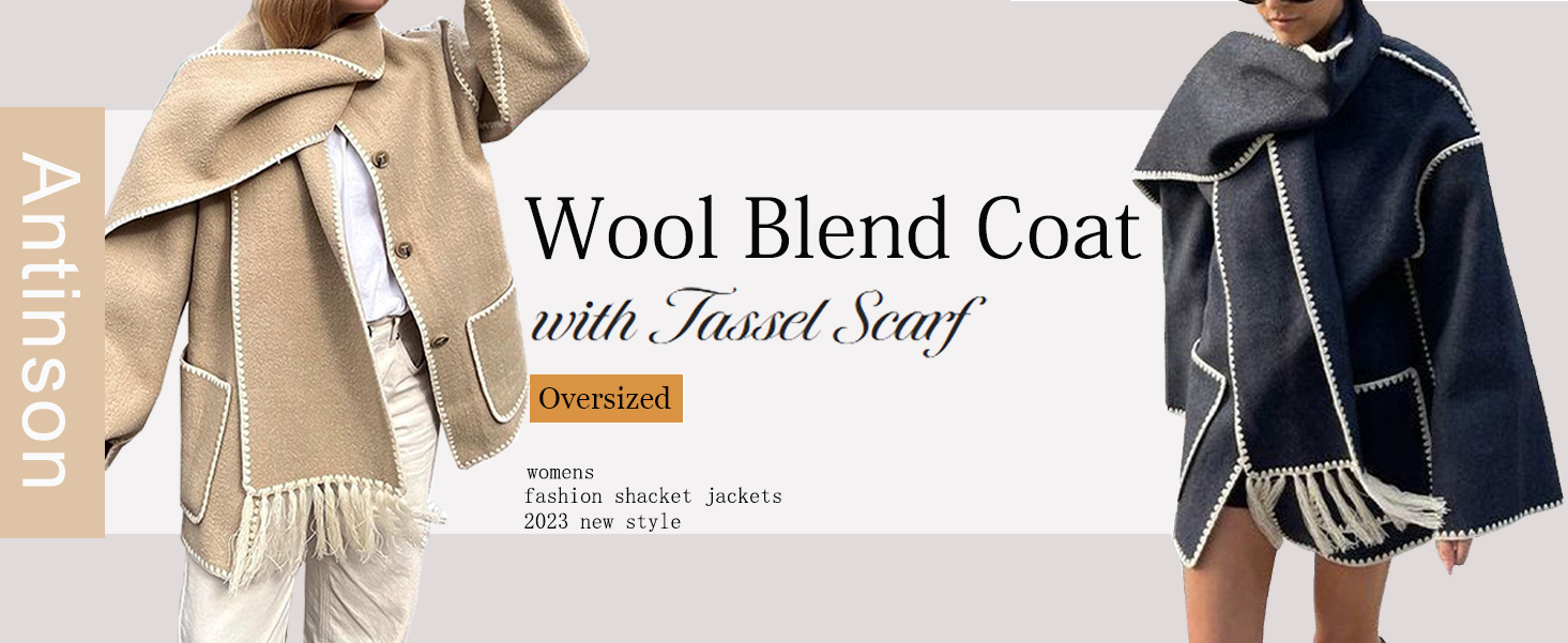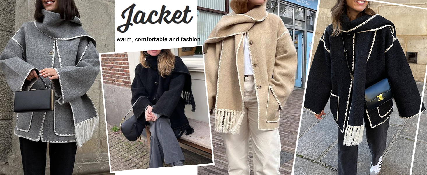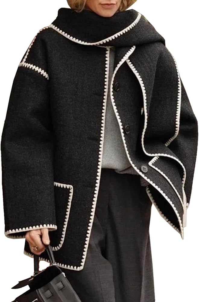 Womens Oversized Wool Blend Jacket With Scarf Button Down Shacket Overcoat Wool Coats with Pockets(-Black-L)