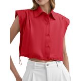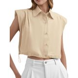 Design: Cropped length, button down, collared, sleeveless, cap sleeve, padded shoulder, adjustable drawstring hem, solid color,relax fit, boxy fit, lightweight, comfy, simple design makes you look more stylish
