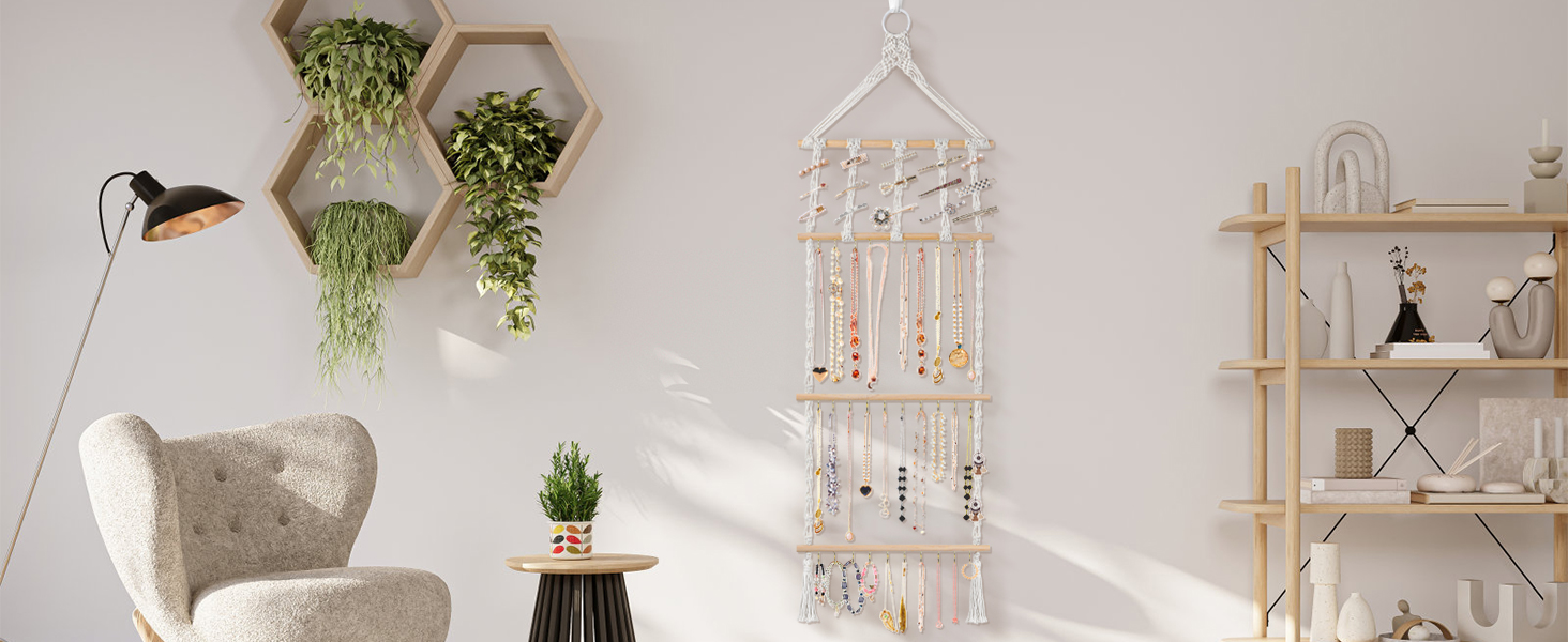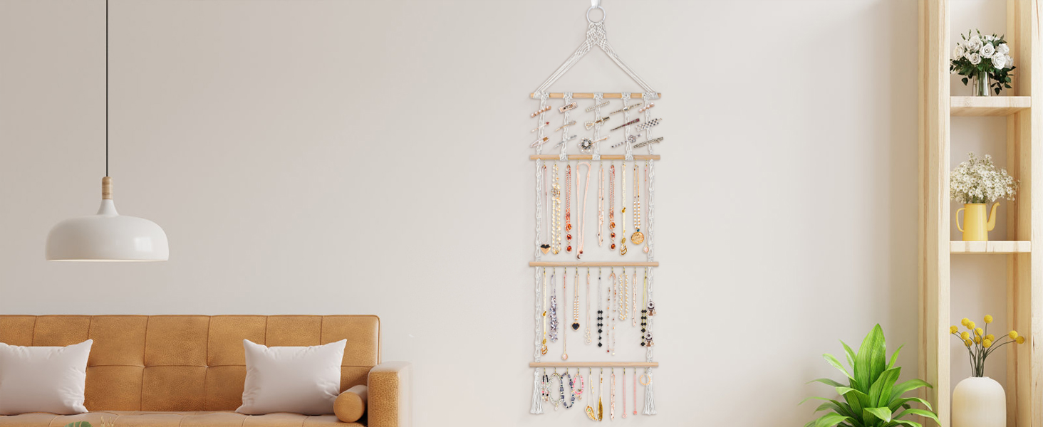 Special Design: Necklace Rack with Tassel is designed with wooden sticks and cotton rope,showing a bohemian style, beautiful and unique, suitable for any home decoration.