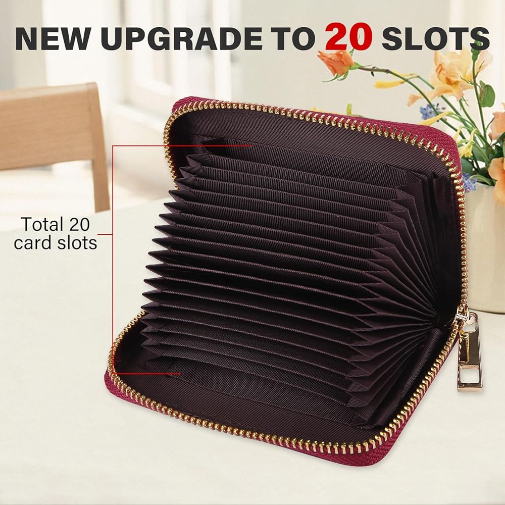 【Capacity】: 20 Secure Card Slots Fold Accordion Style (18 Single Credit Card Slots for 2 Cash Slots). The Large Card Organizer can hold credit cards, debit cards, ID cards.The ID window can hold photo or ID card.