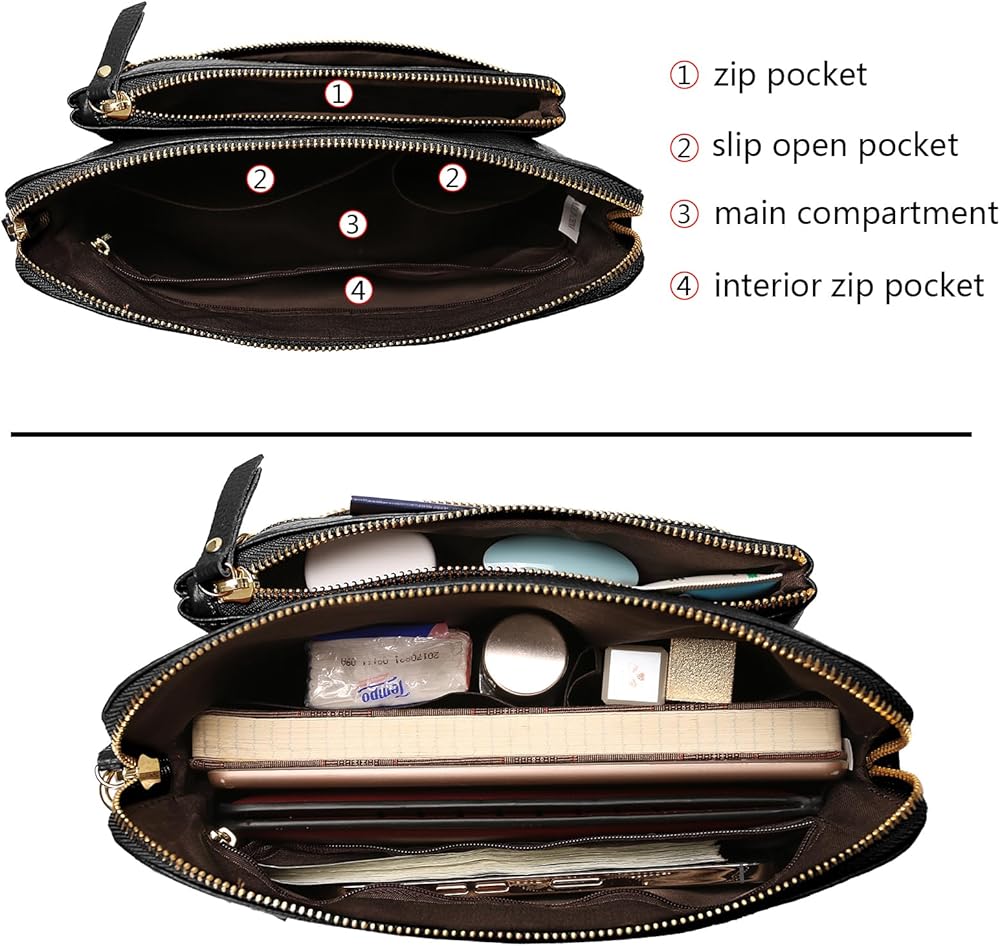 【Functional】 Main zipper compartment contains 1 inner zip pocket and 1 slip pocket. 2 front zipper pockets, 1 back zipper pocket. Multiple pockets keep things Well organized to hold your cell phone, credit cards, keys, money, passport, checkbook, makeup, tissues, lipstick, eyeglasses, sunglasses, etc.