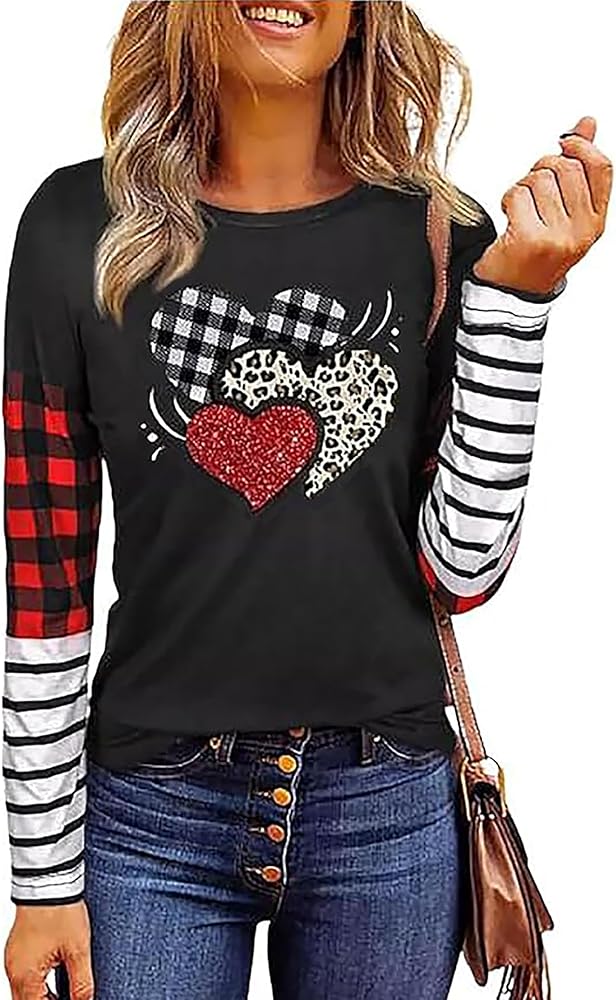 Valentine Plaid Love Heart Striped Blouse for Women Valentine's Day Gift Long Sleeve Splicing Tops T Shirt