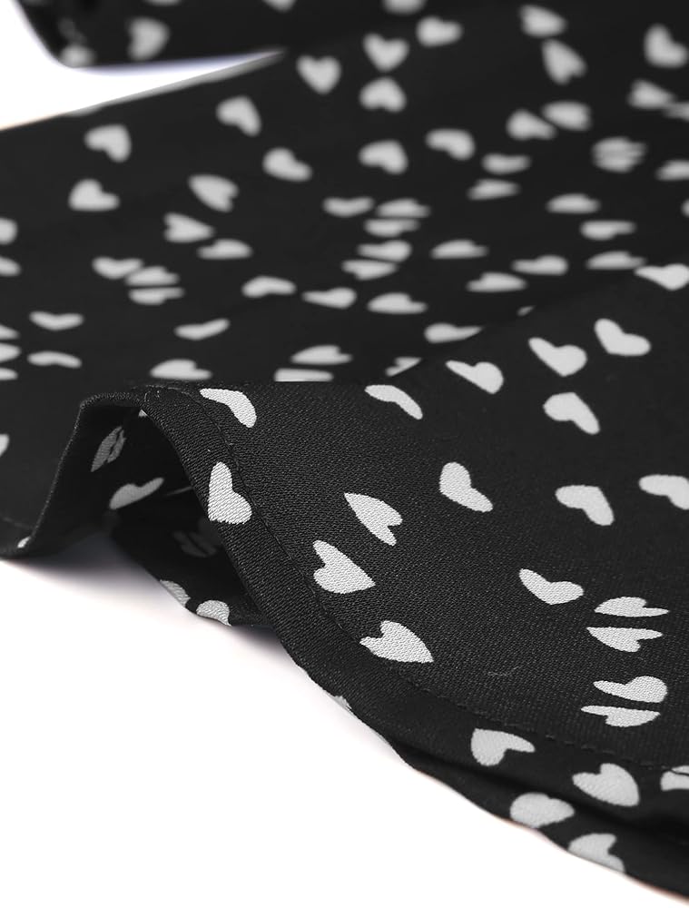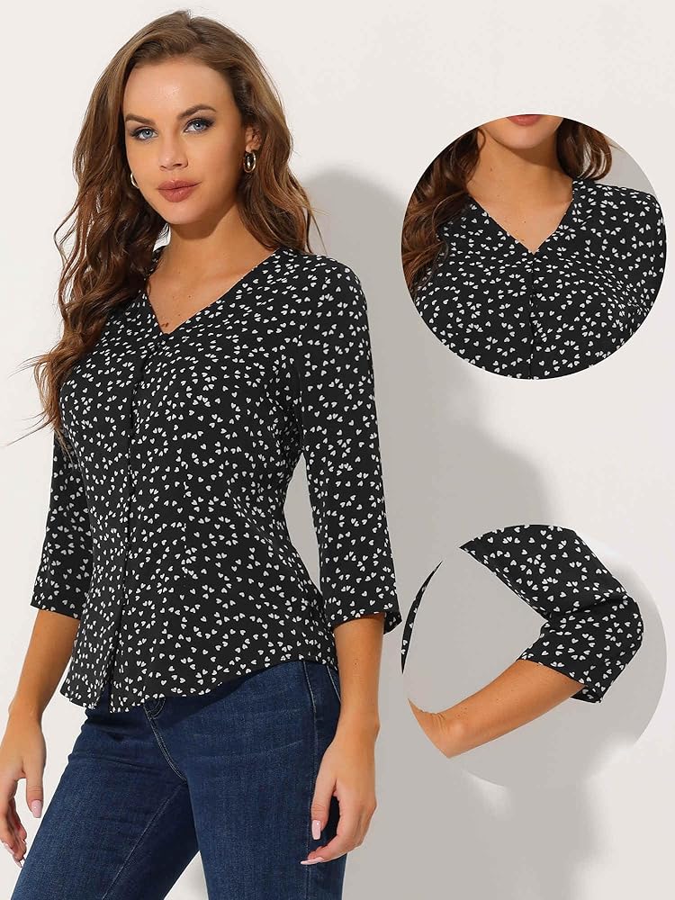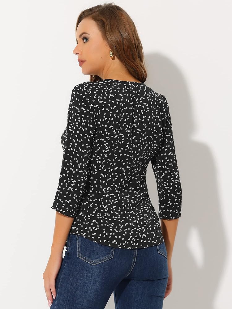 Allegra K 3/4 Sleeve Top for Women's Heart Print V Neck Button-Up Casual Blouse Shirt