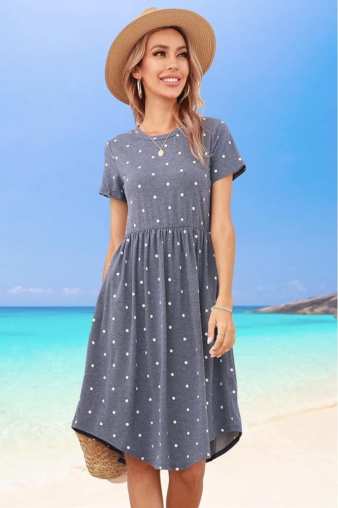 Comfy yet super cute dress.Fun and colorful print.Crewneck.Short Sleeve.Elastic Empire Waist.Curved Hem.Midi Knee Length.Invisible Pockets.