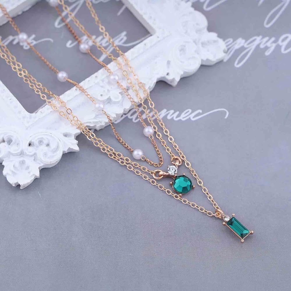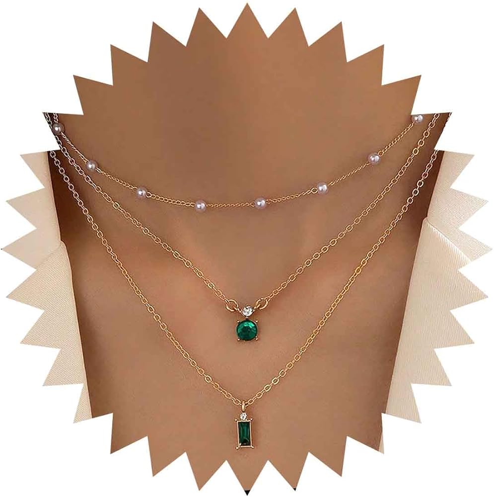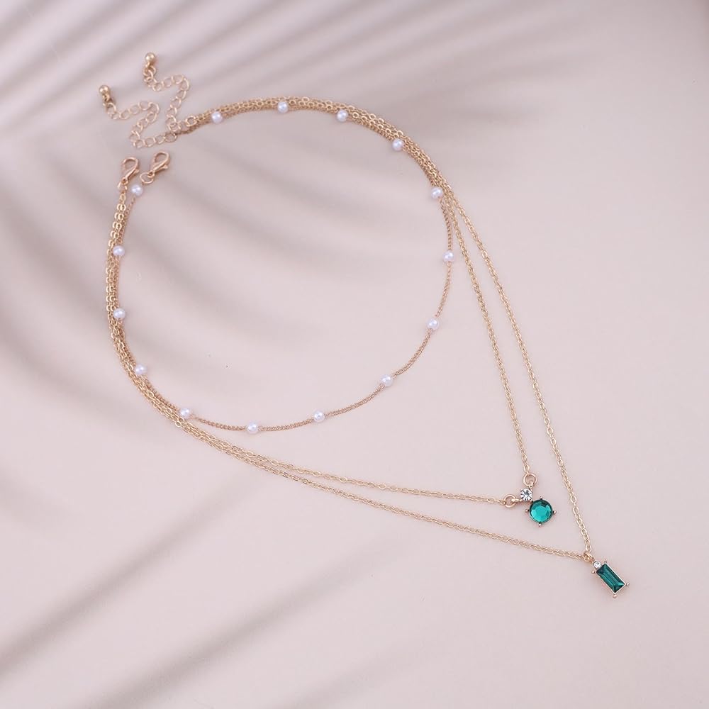 Vintage Layered Emerald Pendant Necklace Gold Pearl Choker Necklace Green Square Crystal Earrings Pearl Satellite Chain Necklace Green Emerald Necklace Chain Jewelry for Women