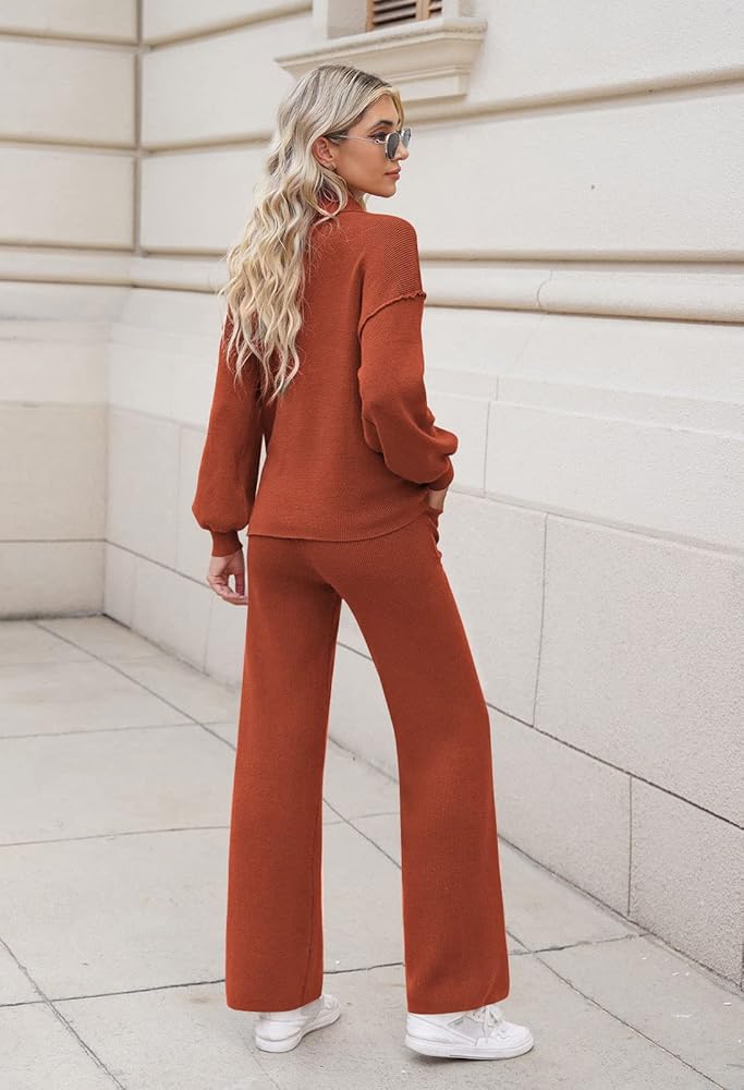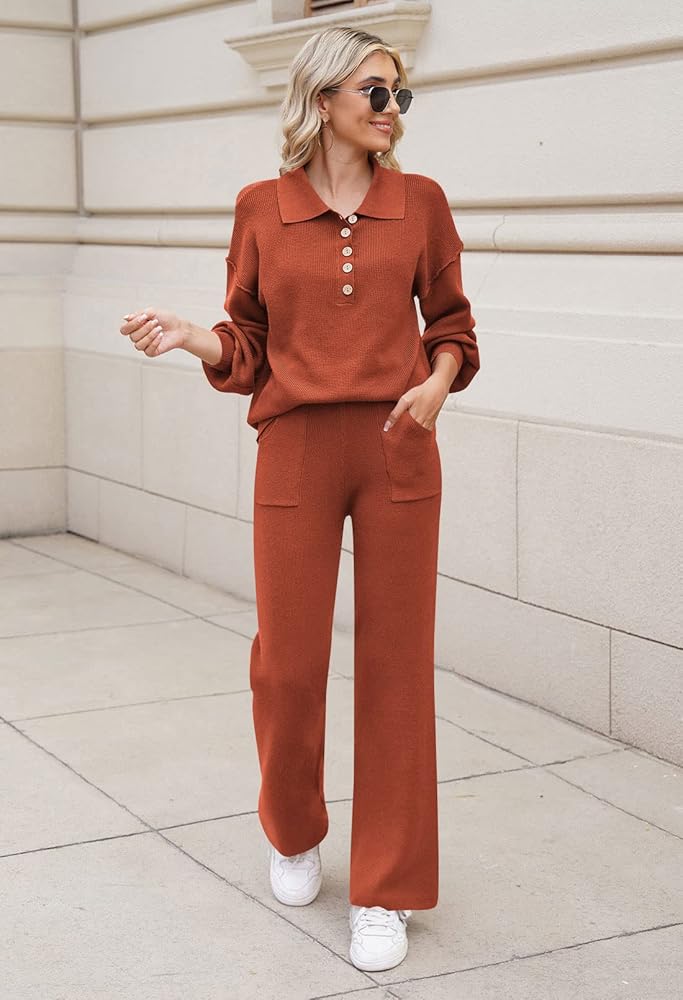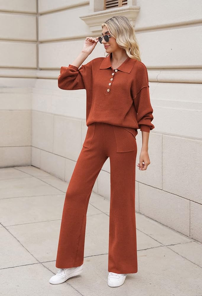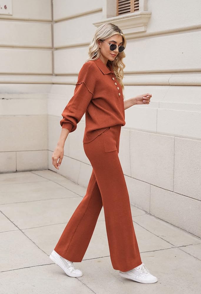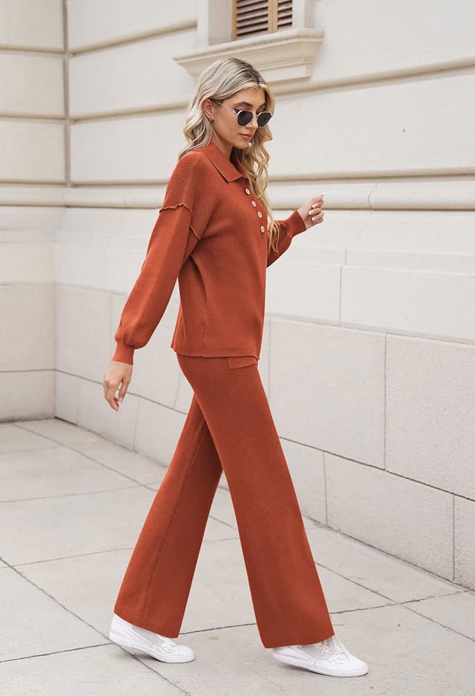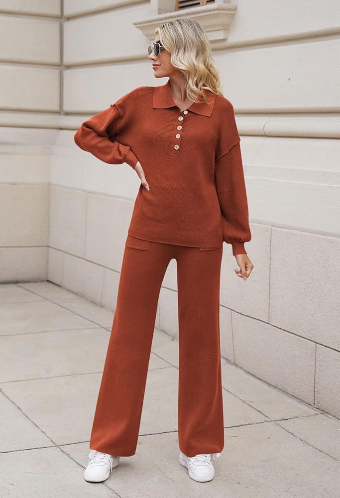 - Button v neck 2 piece outfits, lapel collar lantern sleeve knitted tops and wide leg pants set