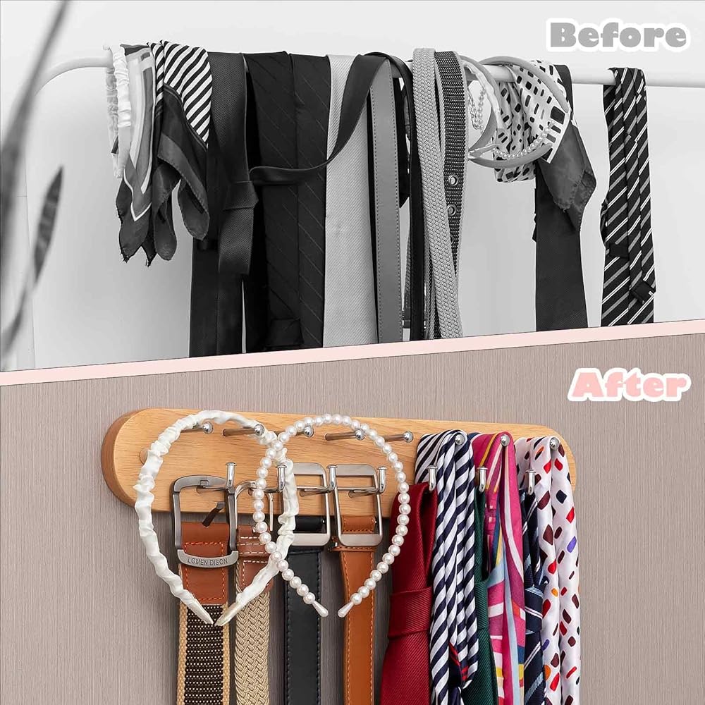 Stylish and Sturdy Rubberwood Base: Our belt and tie holder elevate your hanging experience with our wall hooks featuring a rubberwood base. Not only do they offer unbeatable functionality, but they also bring a touch of elegance to your space with their attractive wood grain patterns.