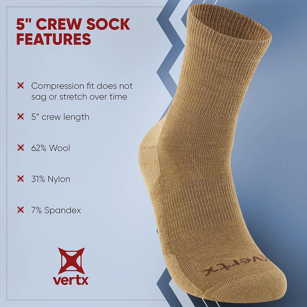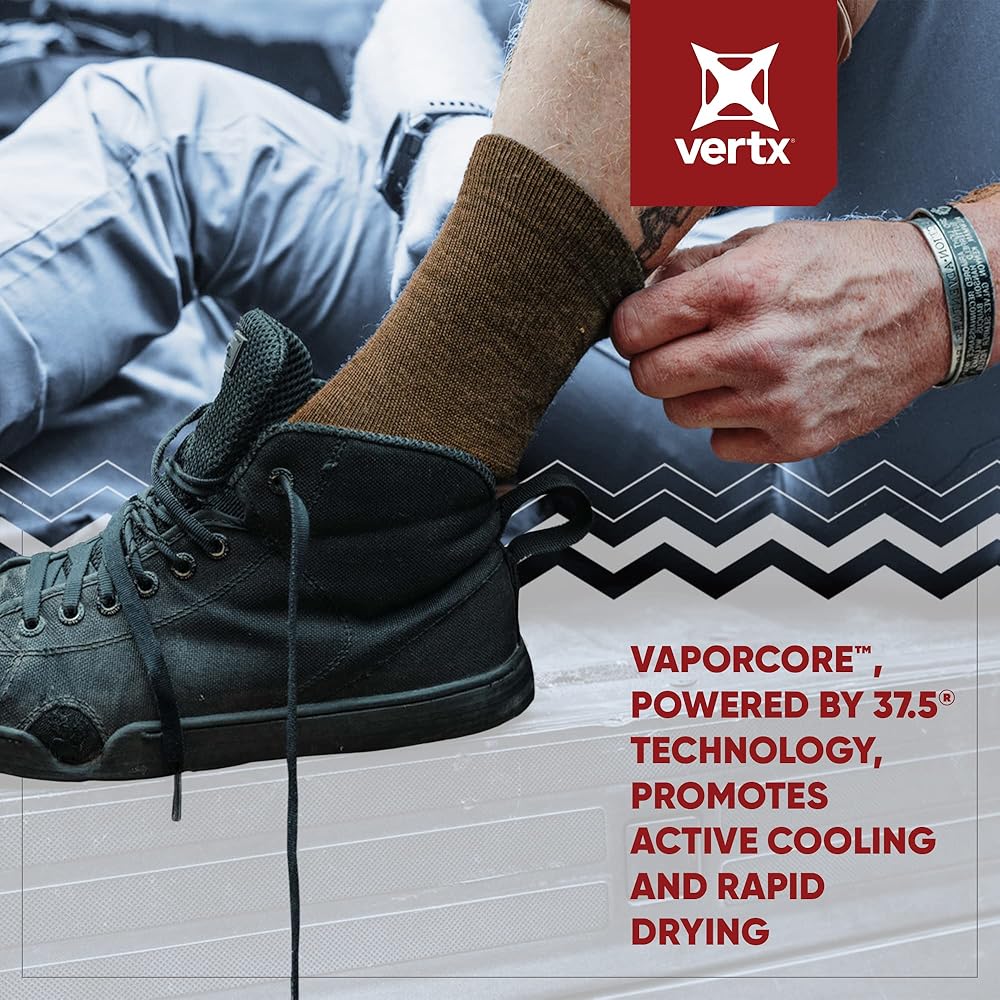 Your feet work hard for you, they deserve the kit to keep them cool, comfortable and protected day in day out. Vertx VaporCore 5" mens crew socks will be up to the job. These merino wool socks for men are made from a high merino wool content, the fibers in the wool trap air to keep you warm and also transport sweat away from the skin to keep you cool. Leaving your feet happy in whatever environment they find themselves in. The temperature regulation is delivered by the 37.5 technology but it also allows the fabric to dry 5x faster than similar fabrics. Merino wool will also work to keep your feet odor controlled by regulating temperature. A knit mesh top to the top of the foot also helps to create breathable socks for men.
