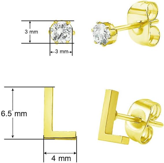 ALPHABET INITIAL EARRINGS & CZ STUDS SET - Our dainty yellow gold tone studs are perfect for everyday wear and are certain to receive compliments. Wear these cute initial studs to represent your name, your loved one, children or family members. Our high polish finish will make these earrings to pop with a brilliant luster and showcase your chosen initials.