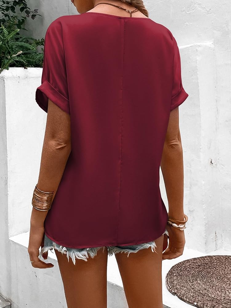 SweatyRocks Women's Roll Up Short Sleeve Notched V Neck Shirt Casual Solid Pullover Blouse Top
