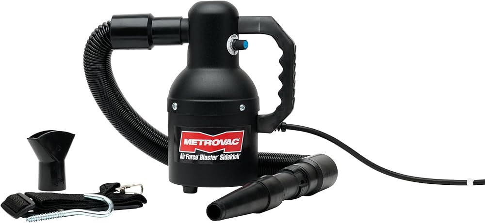 IMPORTANT! THIS DRYER IS NOT LARGE ENOUGH FOR DRYING CARS AND TRUCKS. For best results drying a car or truck, please purchase one of Metro's larger dryers. THIS SIDEKICK FEATURES a 12 foot heavy-duty power cord, durable neoprene nozzle and air-flare, as well as an EZ Change foam filter. MADE IN THE USA - Because it matters! IMPORTANT: This product has a 120v motor and is made for use in the U.S. DO NOT USE WITH 220v power and/or a converter.