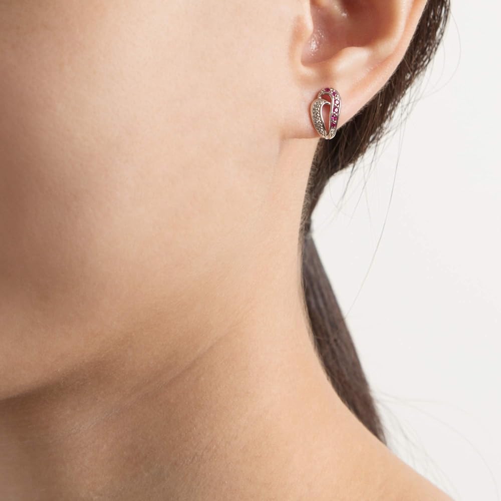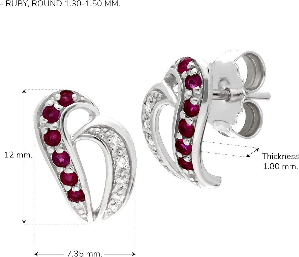 These earrings are made with certified genuine gemstones. The pair features six round 1.5 and 1.3 mm ruby and four natural round diamond accent on each side.