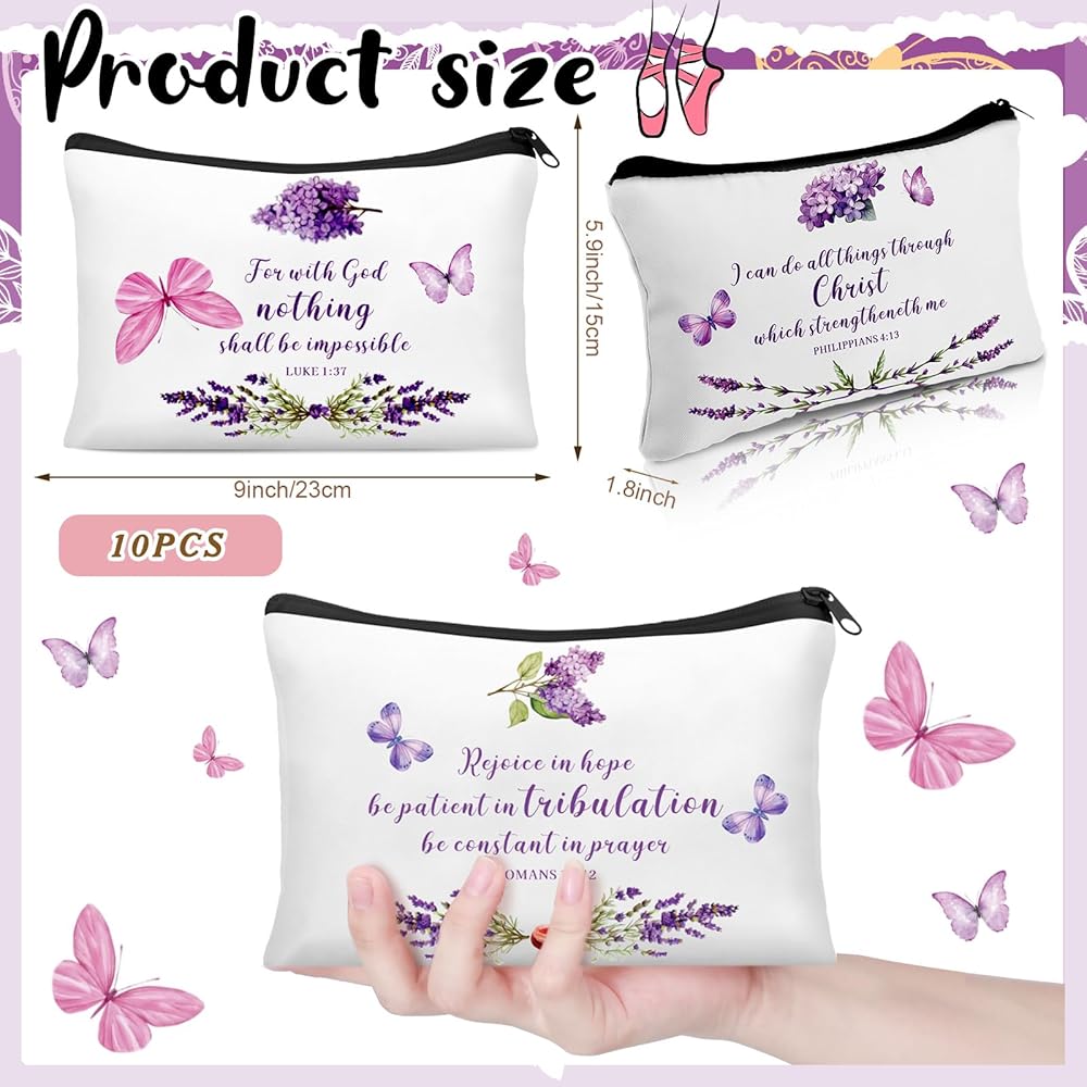 Appealing Aesthetics with Meaningful Messaging: these makeup cosmetic bags are not just functional, they're also visually appealing; Each of the 10 bags with 10 styles comes with purple butterfly and lavender design that's sure to turn heads; Furthermore, they're not only aesthetic, but also inspiring, as they're emblazoned with uplifting words to start your day on a positive note