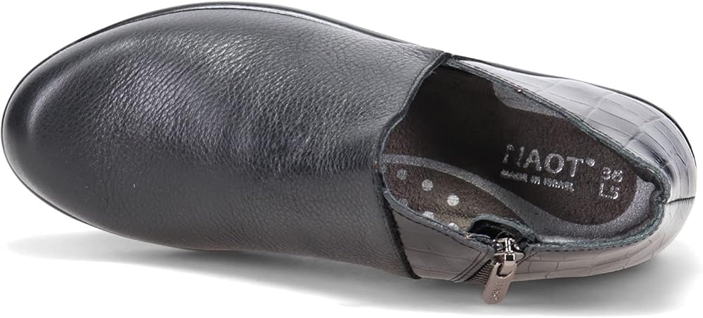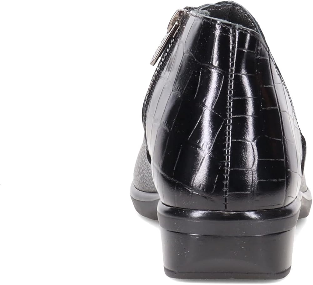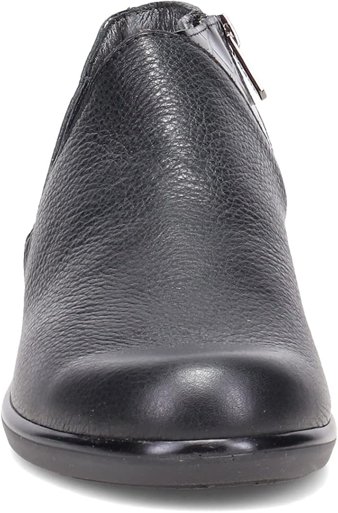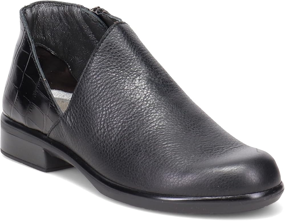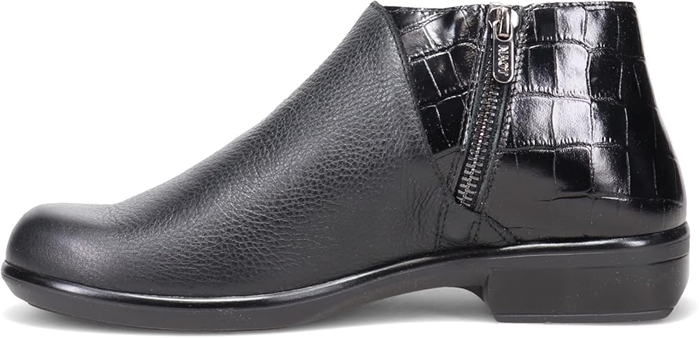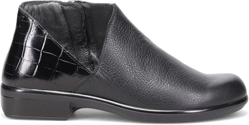 The Bayamo Low Ankle Bootie by Naot is the perfect addition to your professional Fall wear. With a chic side scoop design and contrast leather uppers, these modern touches will bring a trendy yet unique look to your work wardrobe. This leather ankle bootie offers an interior side zipper for an easy slip on and off as well as a removable cushioned insole for added practicality. Pair the Bayamo with your wide leg trousers and a fitted blazer for a chic Fall work style! Leather Uppers; Interior Side Zipper for Easy Slip On; Removable Insole ; Orthotic Friendly ; Hand Sewn Strobel Construction ; Metal Shank; Aura Footbed: Medium Width; Polyurethane Sole ; Heel Height: 1.5 inches ;