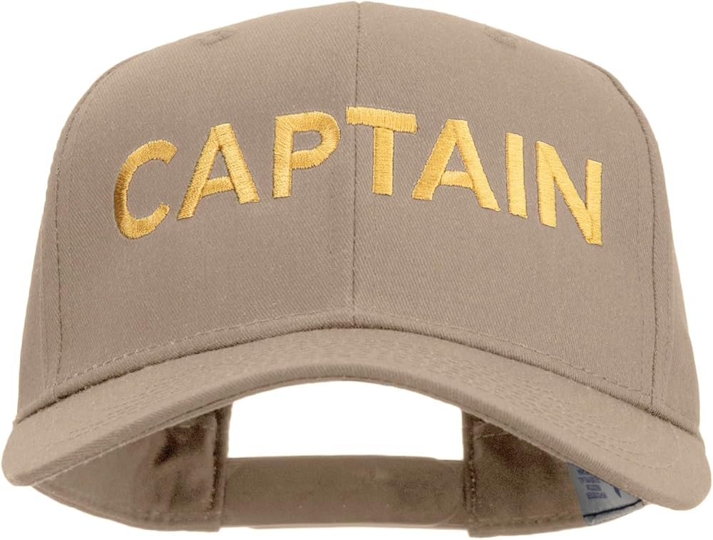 Solid in color baseball cap, with embroidered wording of captain is embroidered on the front crown of cap.
