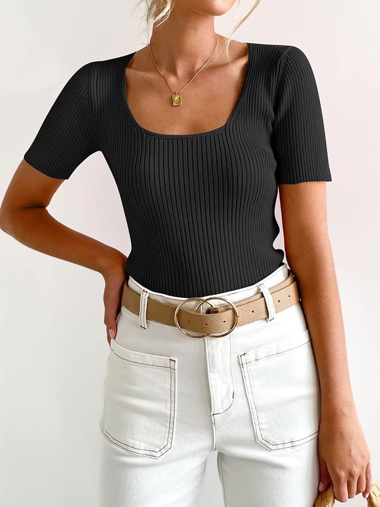 - Short Sleeve Shirts for Women: square neck tops, ribbed detailing, tight fit, short sleeve top;