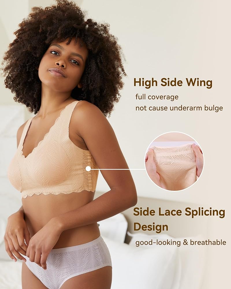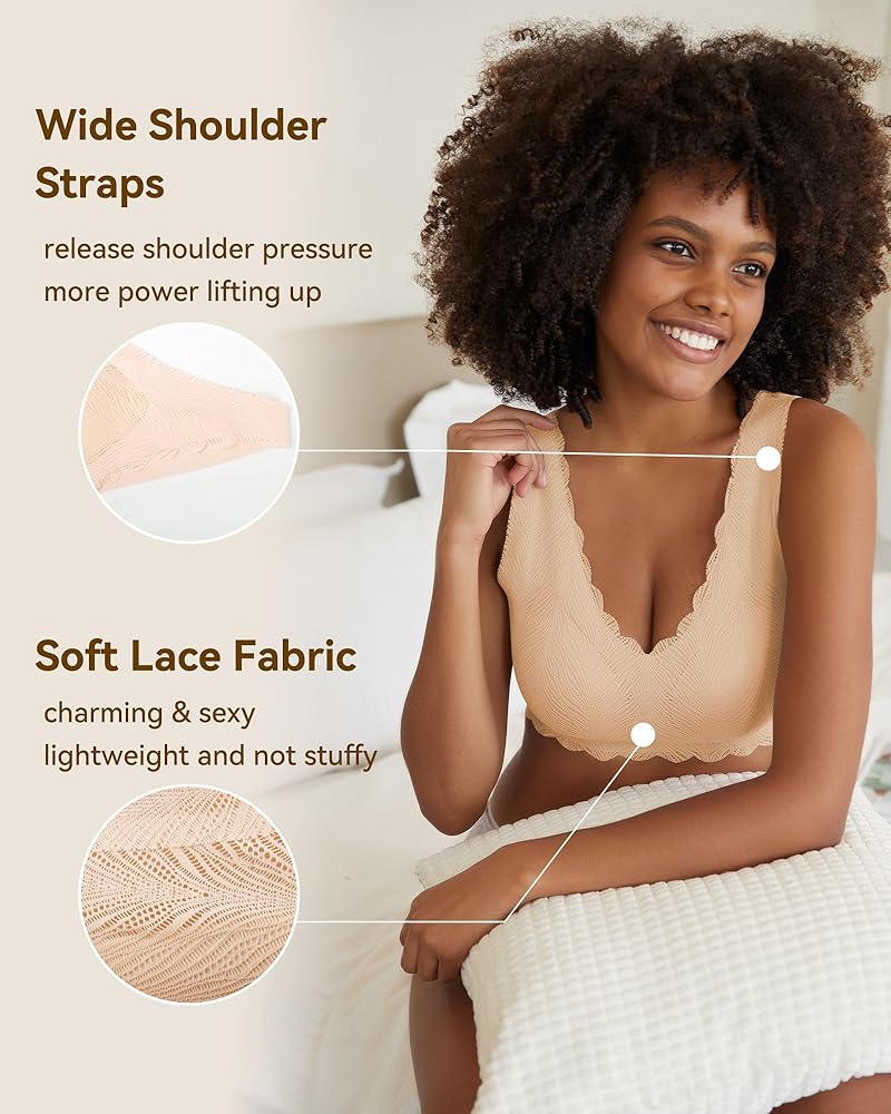 WIREFREE SUPPORT BRA : Our seamless wireless bra has smooth, flexible microfiber and clean cut edges, invisible under clothing. Feminine and sexy design made with soft and delicate lace. Not only makes you look fabulous and sexy, but also gives you light, comfortable support for your breasts.The comfort bra has non-removable chest pad can better support your chest shape, will not move, and is easy to clean (machine washable).
