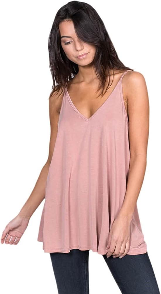 FLOWY & SLIM FITTING: Sexy summer spaghetti strap cami designed to be flowy and slimming to easily hide trouble mid-areas. This sexy cami features a double V-neck with an open back and the spaghetti straps allow for this cami to be loose and breathable while super soft and not cling to the body.
