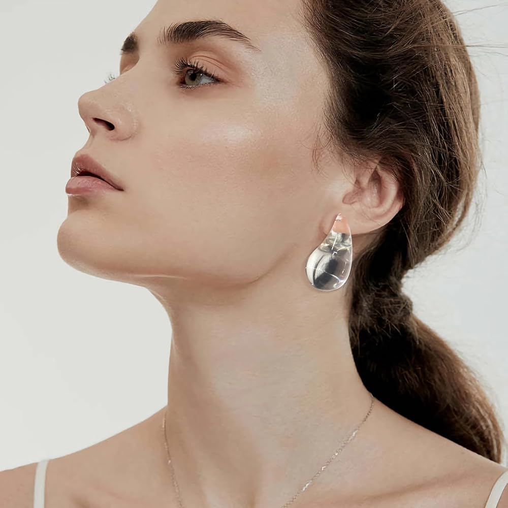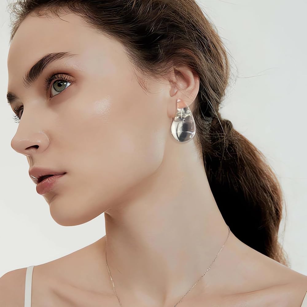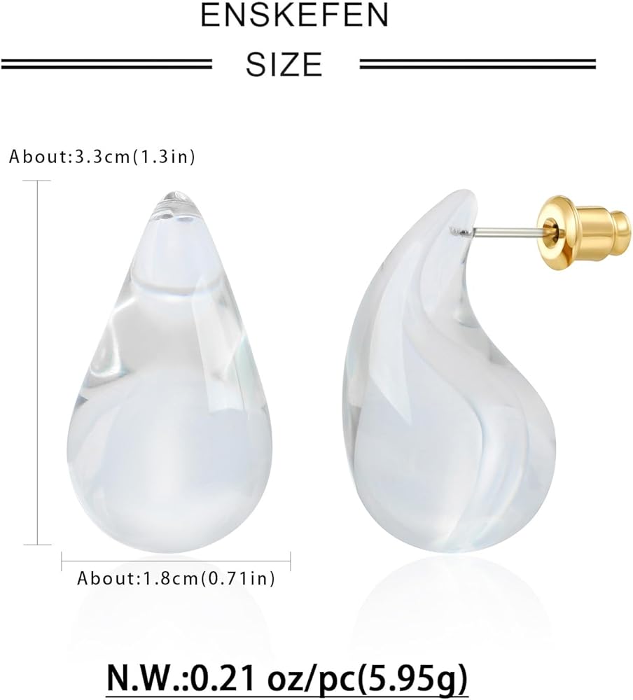 Chunky Lightweight Earrings: ENSKEFEN chunky teardrop hoop earrings size:1.3*0.71inch, net weight:0.21oz/pc. Clear white waterdrop earrings are chunky lightweight and easy to wear that can match a variety of styles.