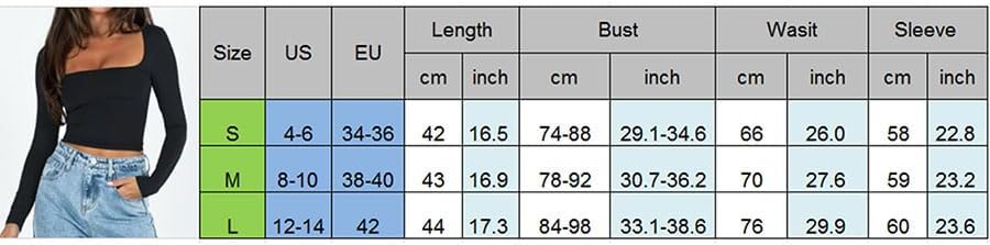 Size: S/M/L; Please check the size chart before you order. Colors: Long sleeve square neck shirt are in a range of colors for you choose. Pakcage included 1PC*Women Y2k Crop Tops Long Sleeve Square Neck Slim Fitted T-Shirt Tops.