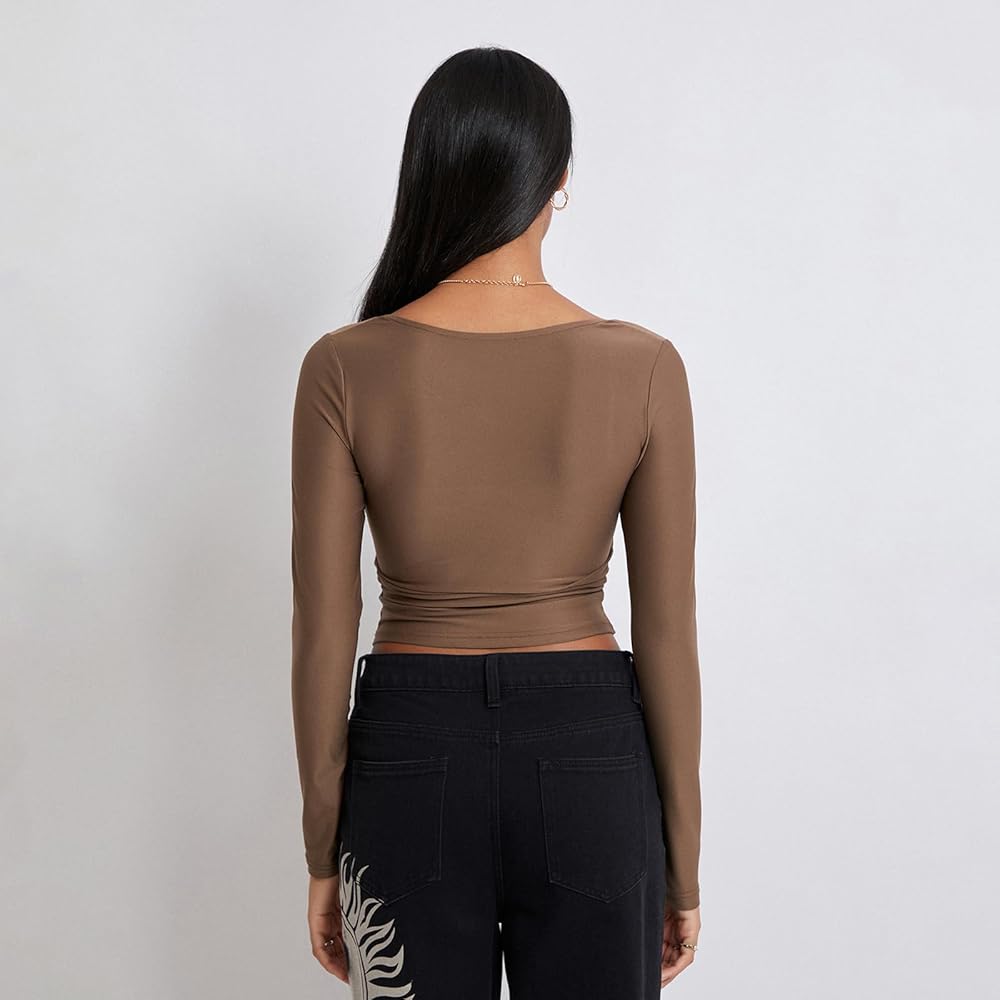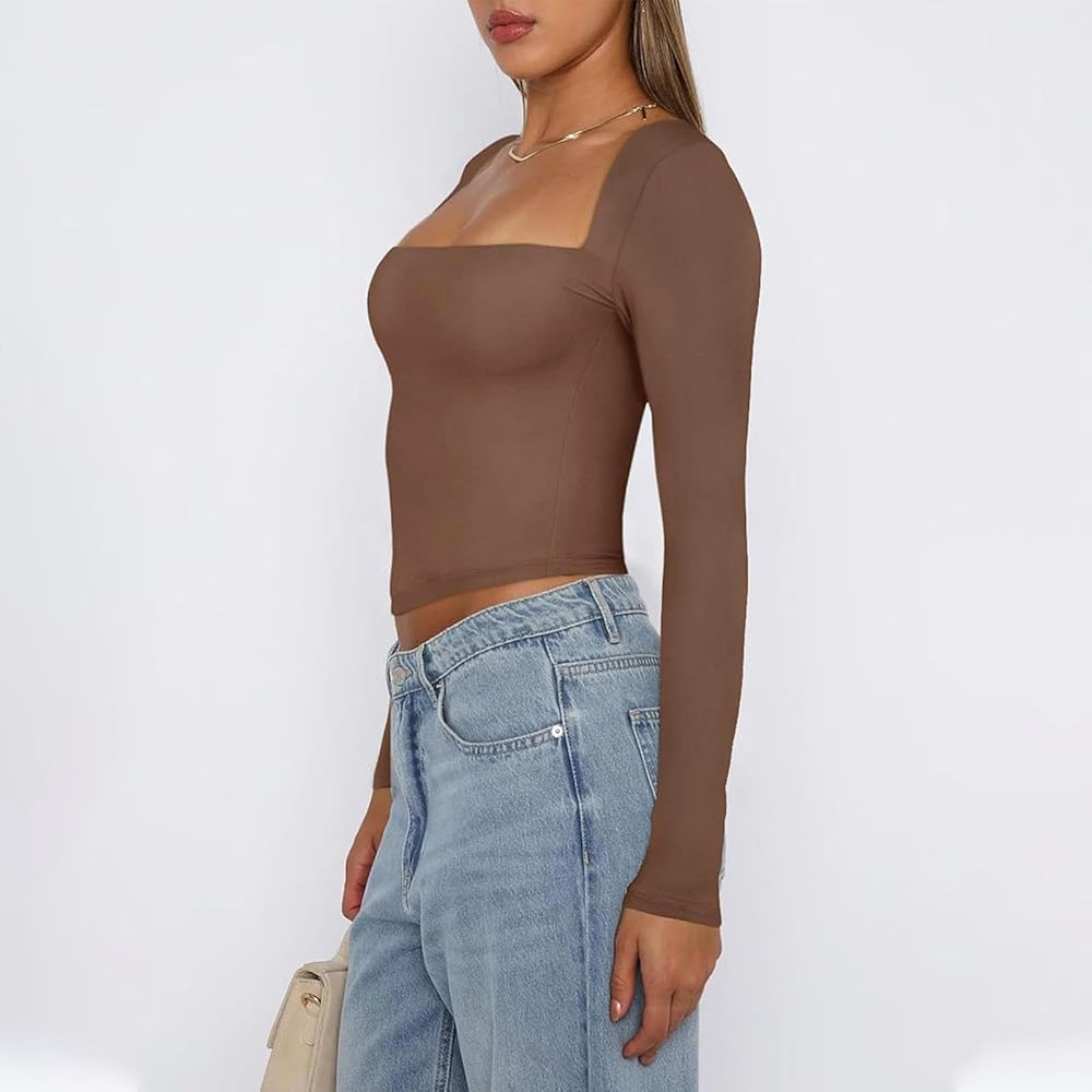 Features : Long sleeve shirts for women, square neck, solid color, slim fit, cropped length. Sexy long sleeve shirts for women, casual style and timeless. Fitted long sleeve shirt women is the must-have item in your wardrobe.