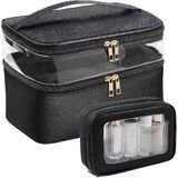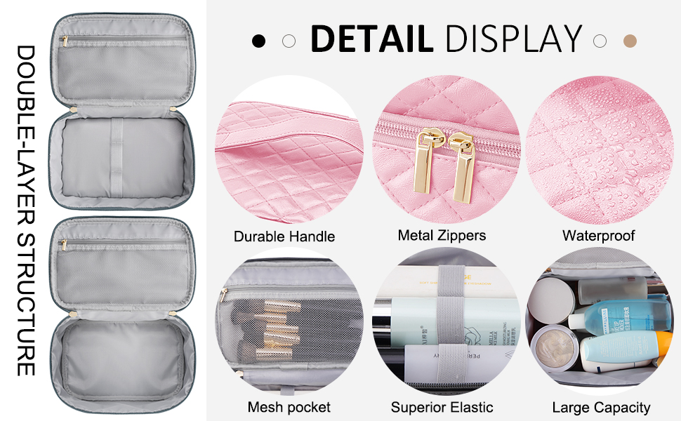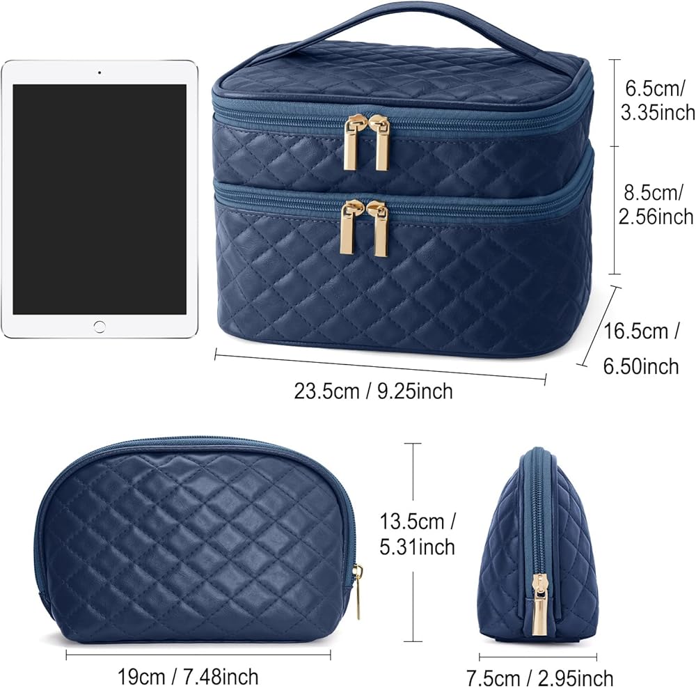 Travel capacity: the large makeup organizer bag adopts a double-layer design, with lifting handle and double zippers. The first layer has a mesh bag and shallow storage space (including 3-section elastic rope), and the second layer has a mesh bag and deep storage space, creating a larger storage space for you. Small cosmetic bag is small and can be easily carried or put into handbag, etc.