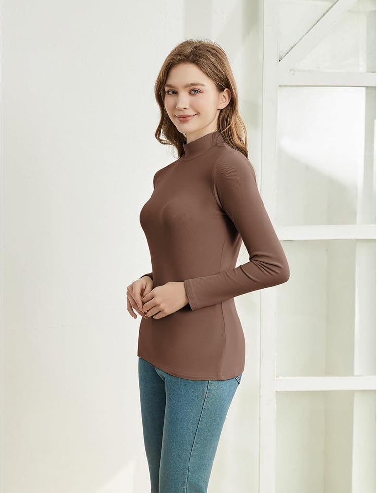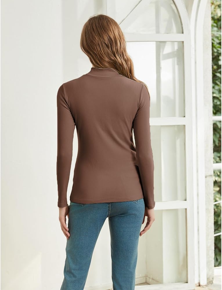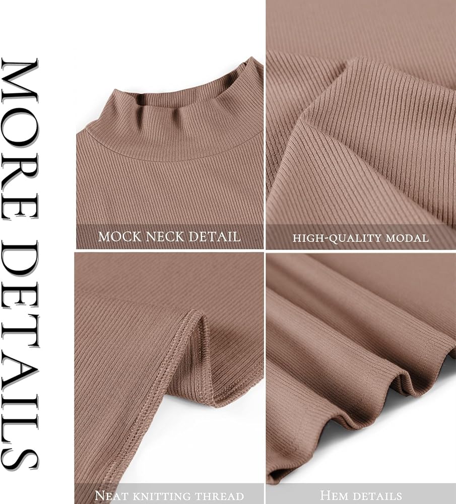 Premium Material: Crafted from a blend of 90.7% Modal and 9.3% Spandex, our fitted tight long sleeve shirts for women boast exceptional qualities. The ribbed knit fabric is skin-friendly, elastic, and resistant to deformation. This trendy mock turtleneck tops for women offer a breathable and soft feel while being wear-resistant and anti-pilling.