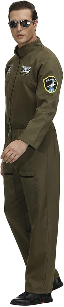 Air Force Men Costume Occasion:the adult flight suit men coveralls.are perfect for cosplay show, stage performance, stage play, Medieval Party or festival parade,bar,halloween party , role play,birthday party, themed party, movie party, Air Force Style Party, Cruise Theme Party Supplies, 1920s, 1950s,1980s Green Flight Army Costumes,etc.