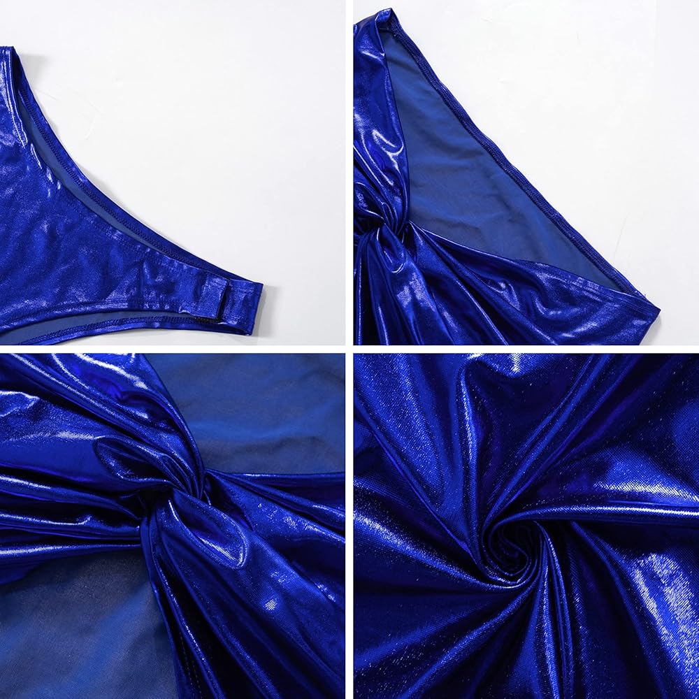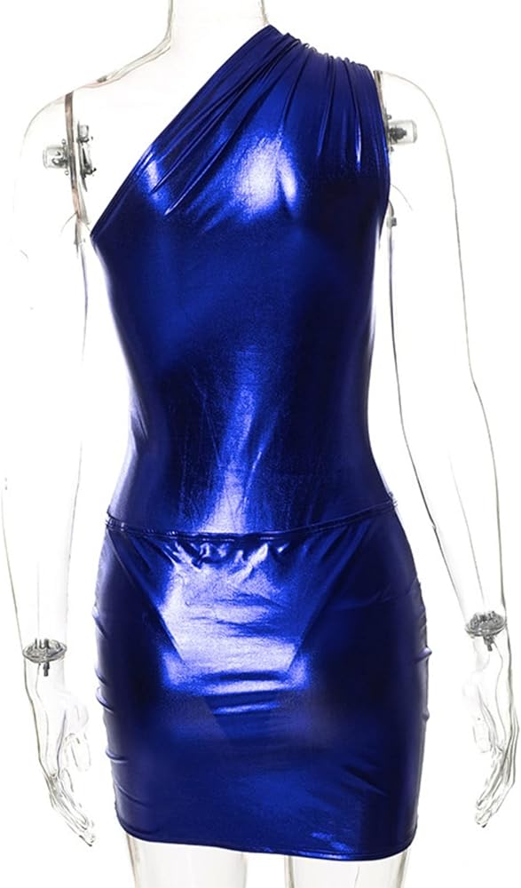 Caviotess Women Sexy Metallic PU Leather One Shoulder Mini Dress 2 Piece Sleeveless Ruched Bodycon Party Club Dress