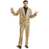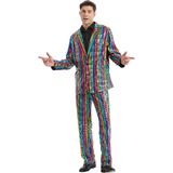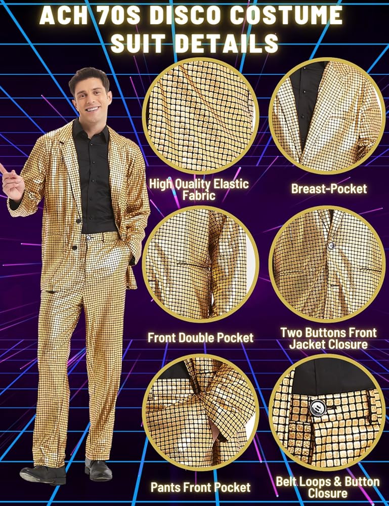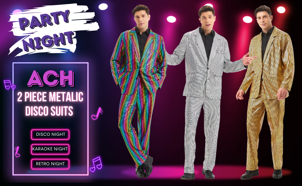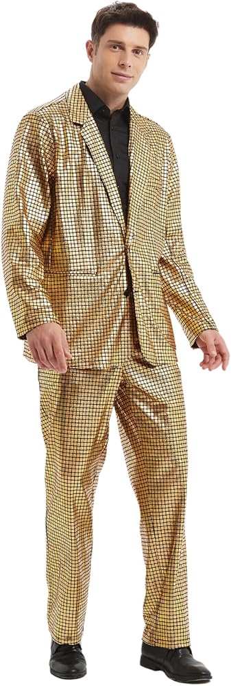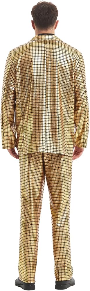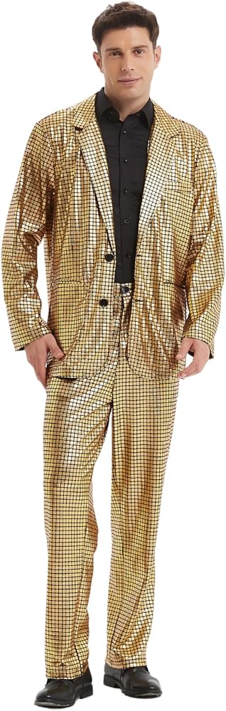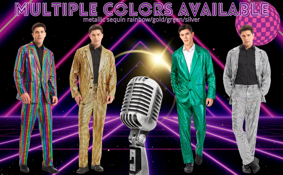Premium 2 Piece Disco Costume Men Included:This mens metallic sequin rainbow/gold/silver/green prom suit consists of pants, jacket (blazer) and a tie. Our adult holiday 70s outfits for men are carefully crafted from superior polyester fabric to keep you snugly warm. All the seams in this halloween suit jacket regular fit are lock stitched for extra strength and to prevent any tearing.The unique fancy shiny suits for men set is ideal for festive season fun or a dress-up party