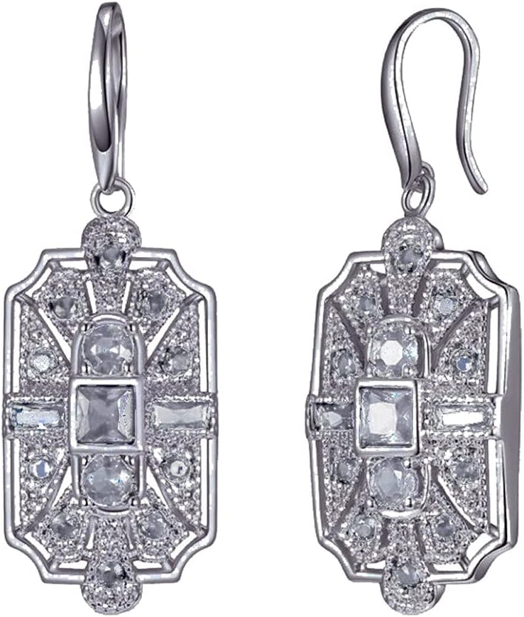 - Silver Tone Classic Art Deco Flapper Geometric Antique Style Wedding Bridal Prom Formal Gatsby Party Rhinestone Dangle Earrings