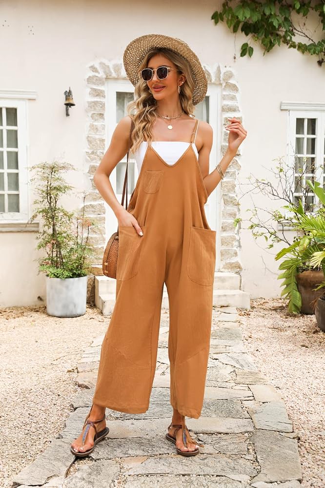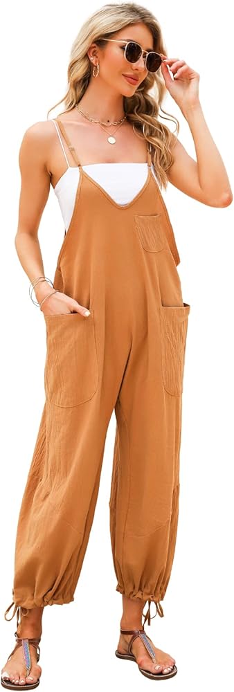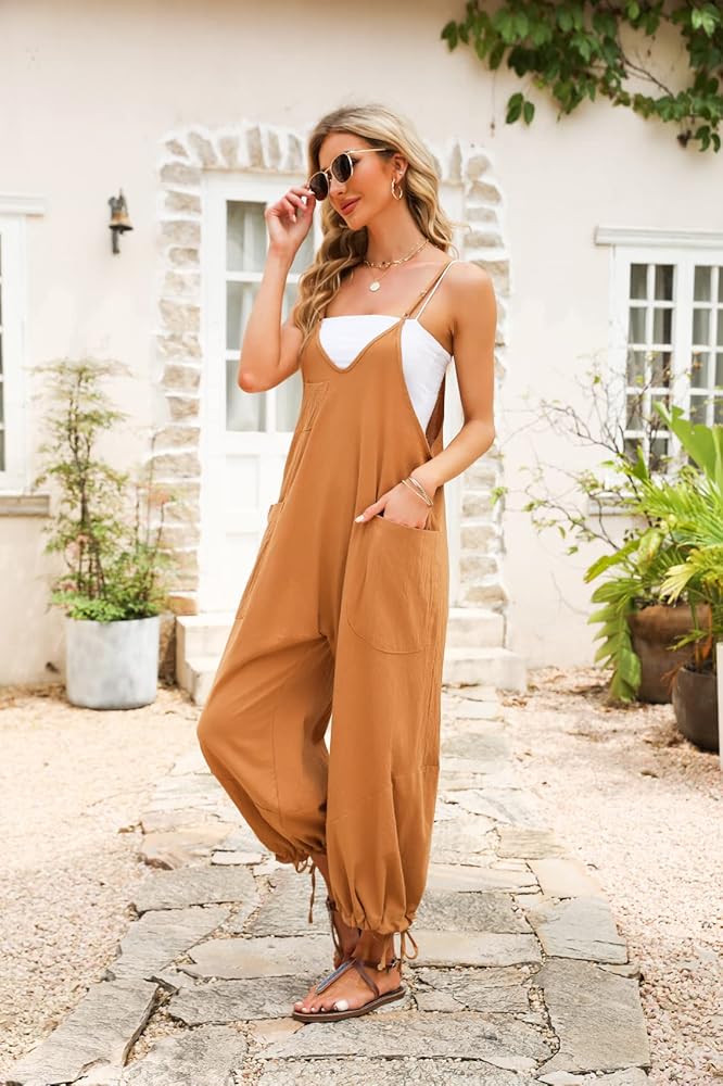 Features: solid color classic V-neck overalls, women's sleeveless jumpsuit with thin shoulder straps, casual loose version design, large patch pockets on both sides, convenient for carrying mobile phones, keys and other items; the small pocket on the chest adds a layer of clothing Playful; drawstring at hems, ties at cuff openings, bow-knotted or free-tying at the bottom.