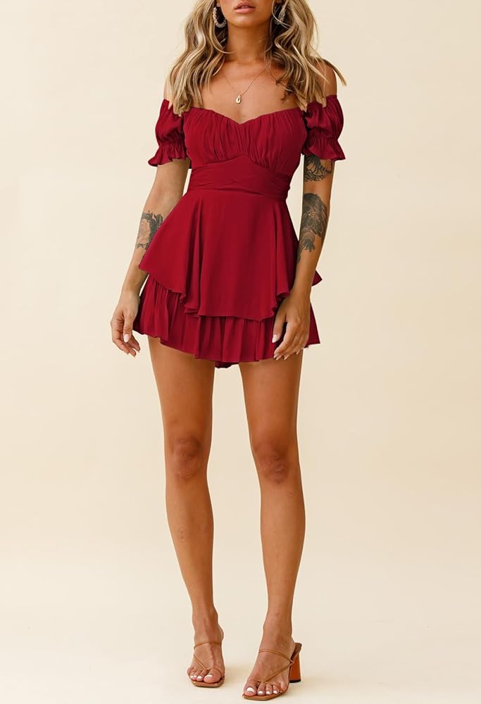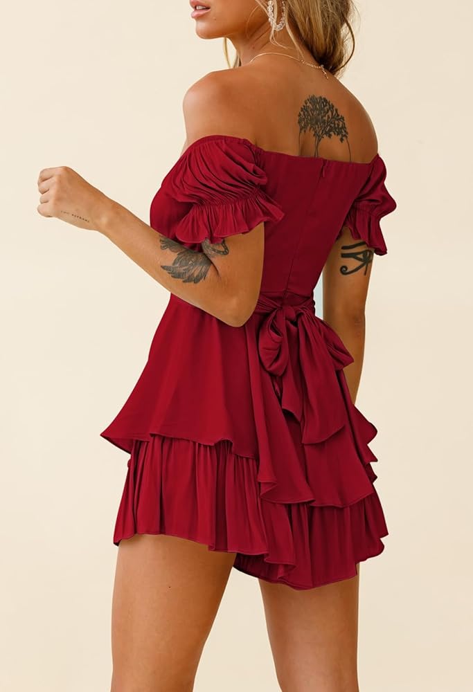 Linsery Off Shoulder Romper for Women Ruffle Layer Summer Boho Chiffon Shorts Rompers Jumpsuits Dress Red L