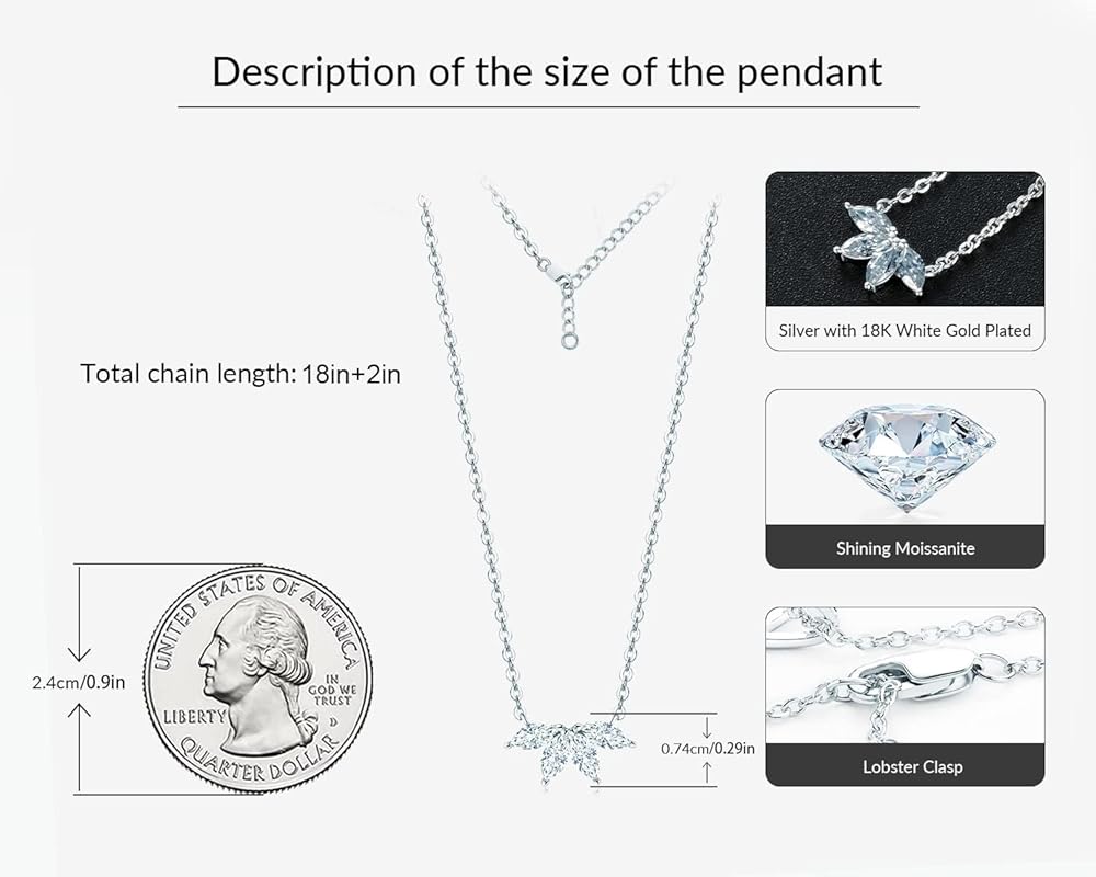 Specification: The heart necklace is made of 3pcs 4mm D-E color moissanite diamonds, total 1.2ct. All the metal material is sterling silver plating with 18K white gold, which is lead free, nickel free and hypoallergenic. The size of the pendant: length-16mm, thickness-2.6mm. The size of chain: 16"+2" (40cm+5cm).