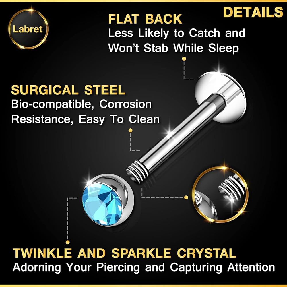 YOU WILL GET Two pieces of 16g (1.2mm) 316L Surgical Steel bar lip ring, 3mm crystal half ball end. There are 4 Lights 6mm 8mm 10mm 12mm and 11 crystal colors for your choice; Clear, Aurora Borealis, Rose, Sapphire, Aquamarine, Blue Zircon, Amethyst, Black Jet, Light Siam, Peridot and Emerald. They are safely store in satin pouch or jewelry box.