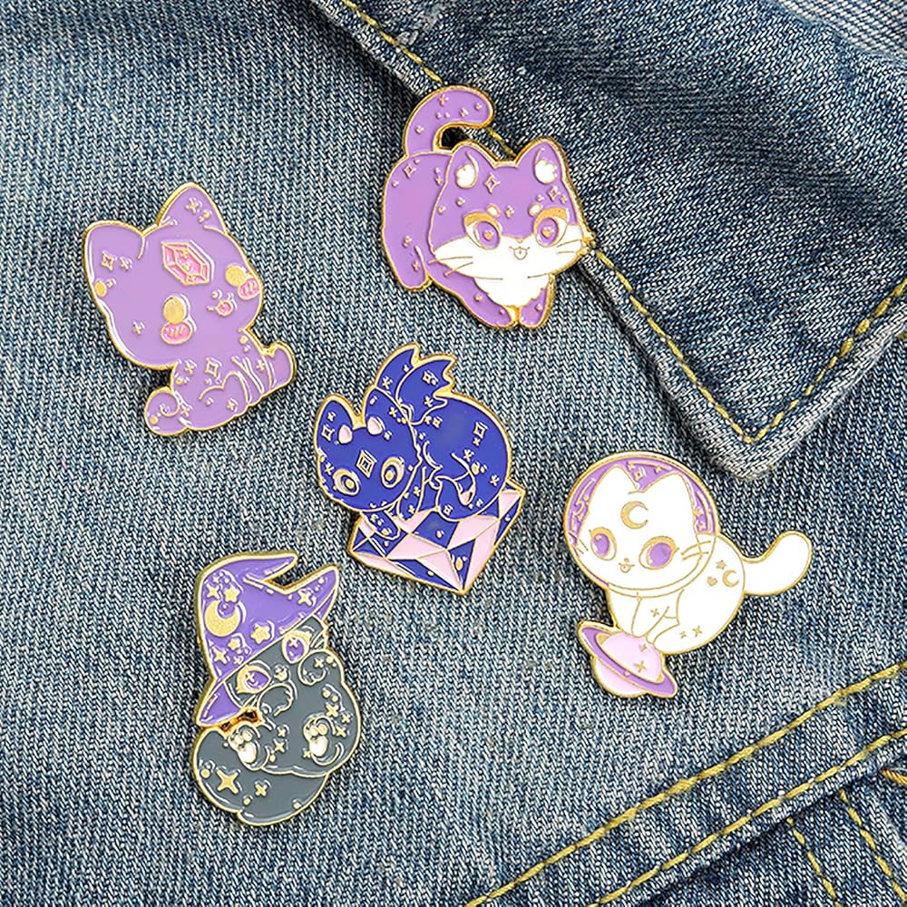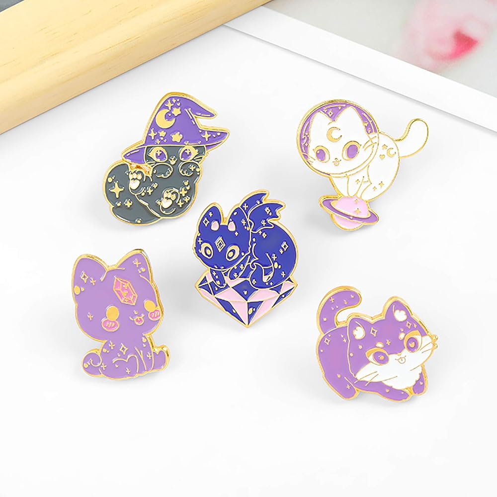 Cat lapel pins design:New cat badge pins still focuses on cute style.Purple adds a mysterious color to the enamel brooch.Cat badge brooch set consist of five different brooches badge -Blue cat Angel sitting on the diamond platform,black cat was sitting on the ground playing,white cat standing on the planet overlooking space,purple cat amuses by itself.If you are a cat lapel brooch lover,you can consider buying some. DIY or decoration will have a different effect.