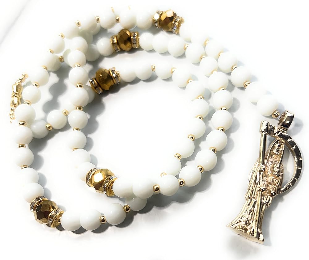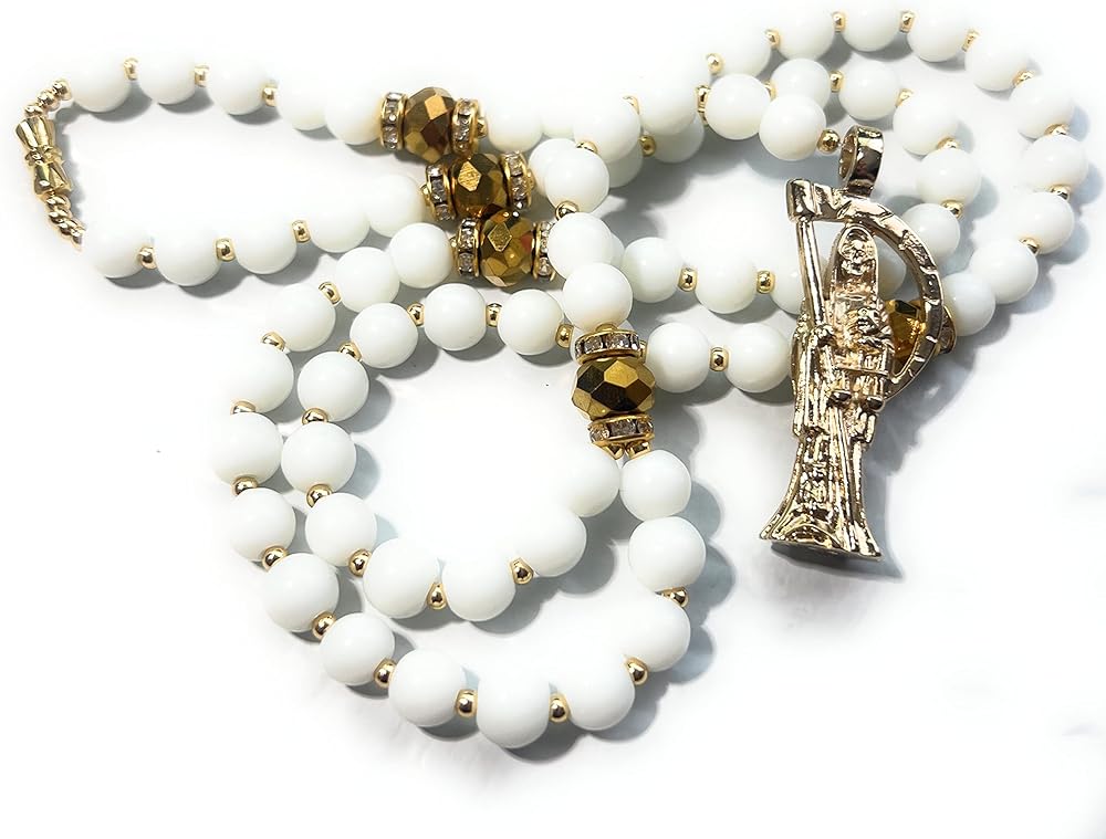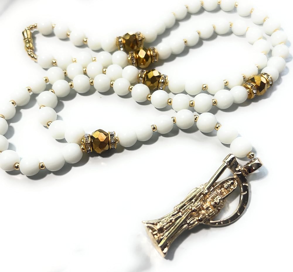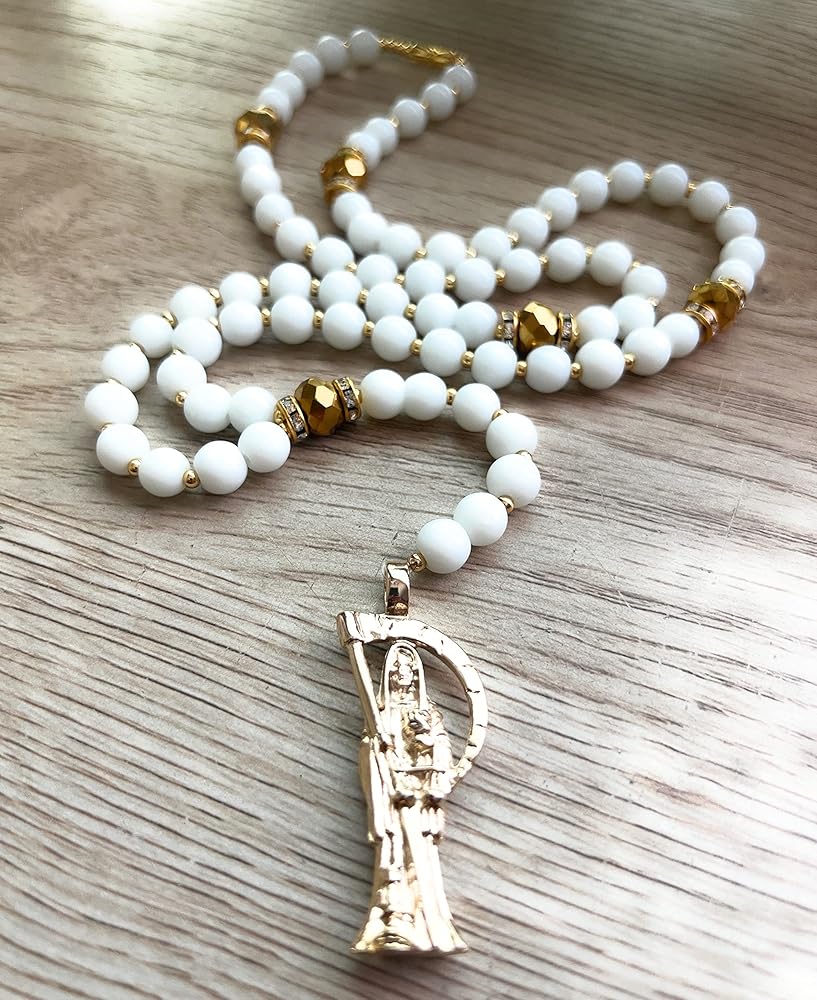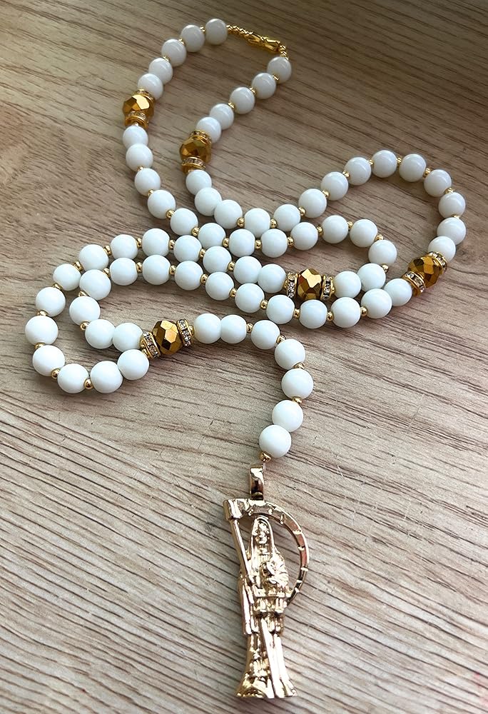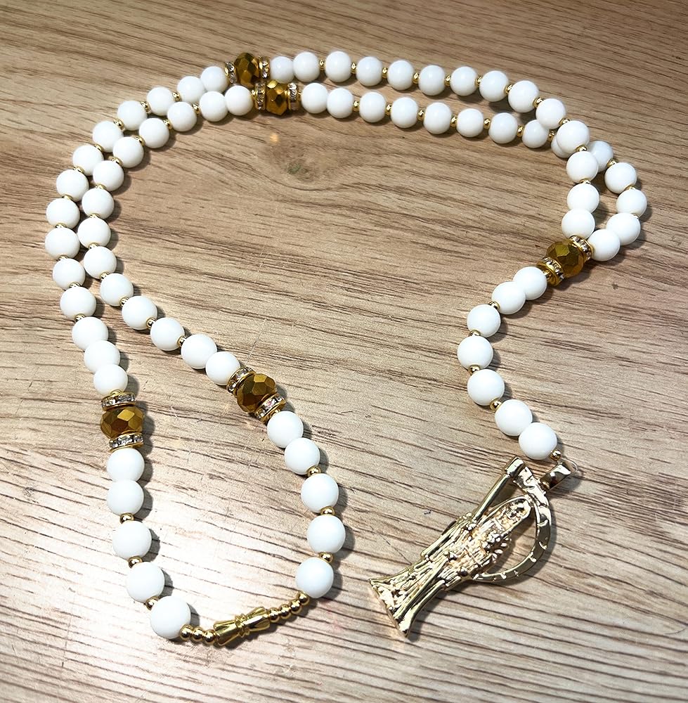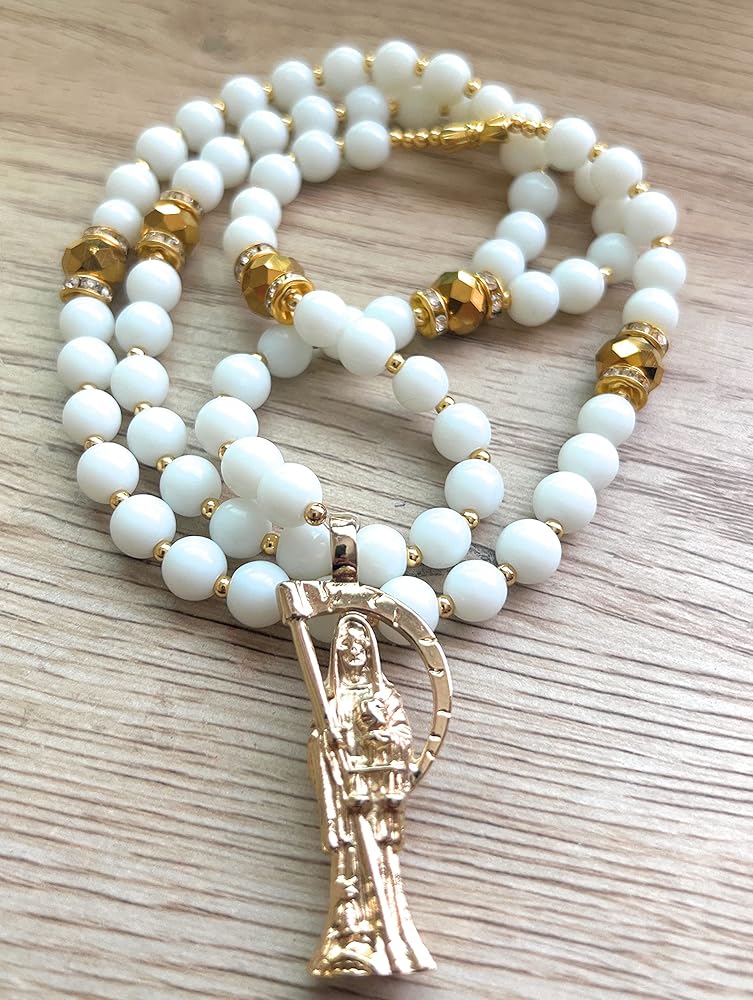 - White and Golden Santa Muerte's rosary. - 6mm white glass beads, - Rosary length from clasp to pendant (rosary closed) 18in, from clasp to clasp 26in (rosary opened). - Charm size: 2 inches